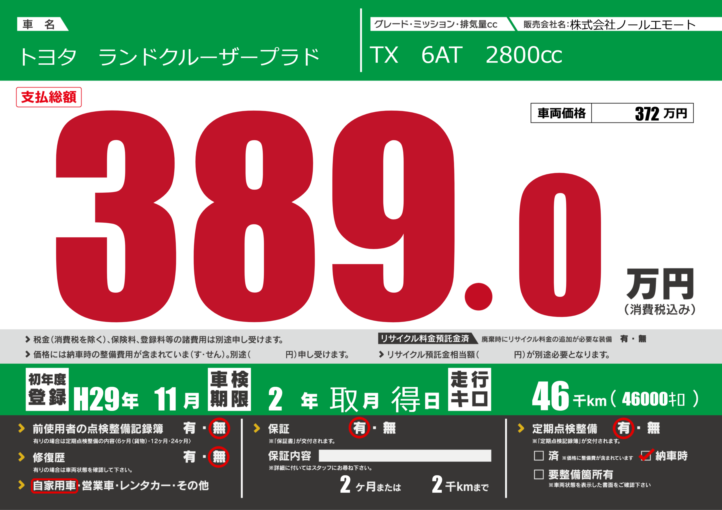 | 定期点検整備 | 定期点検整備あり 納車時あり | ||