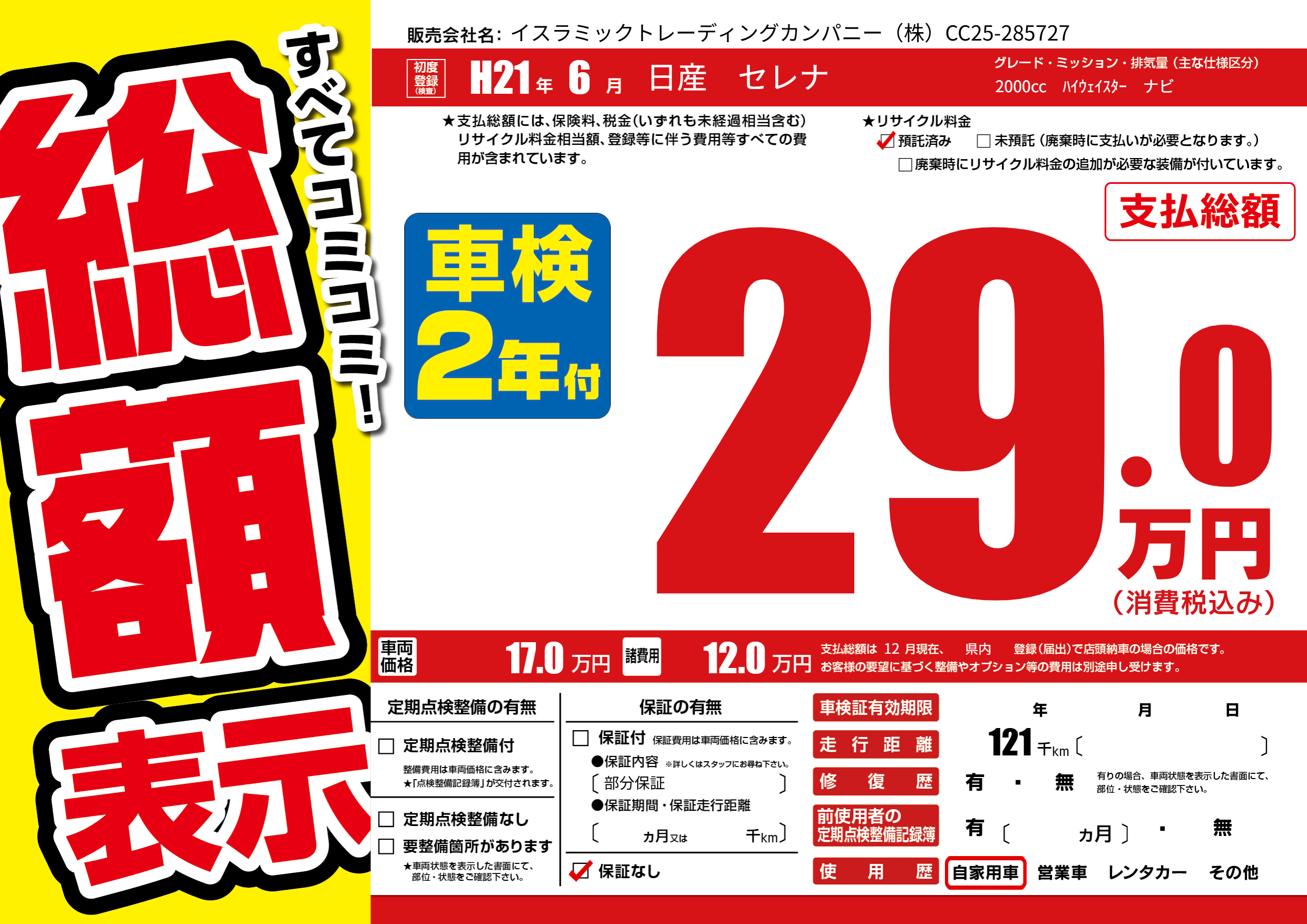 | 走行キロ | 12.1万km | 初年度登録 | H21年6月 |