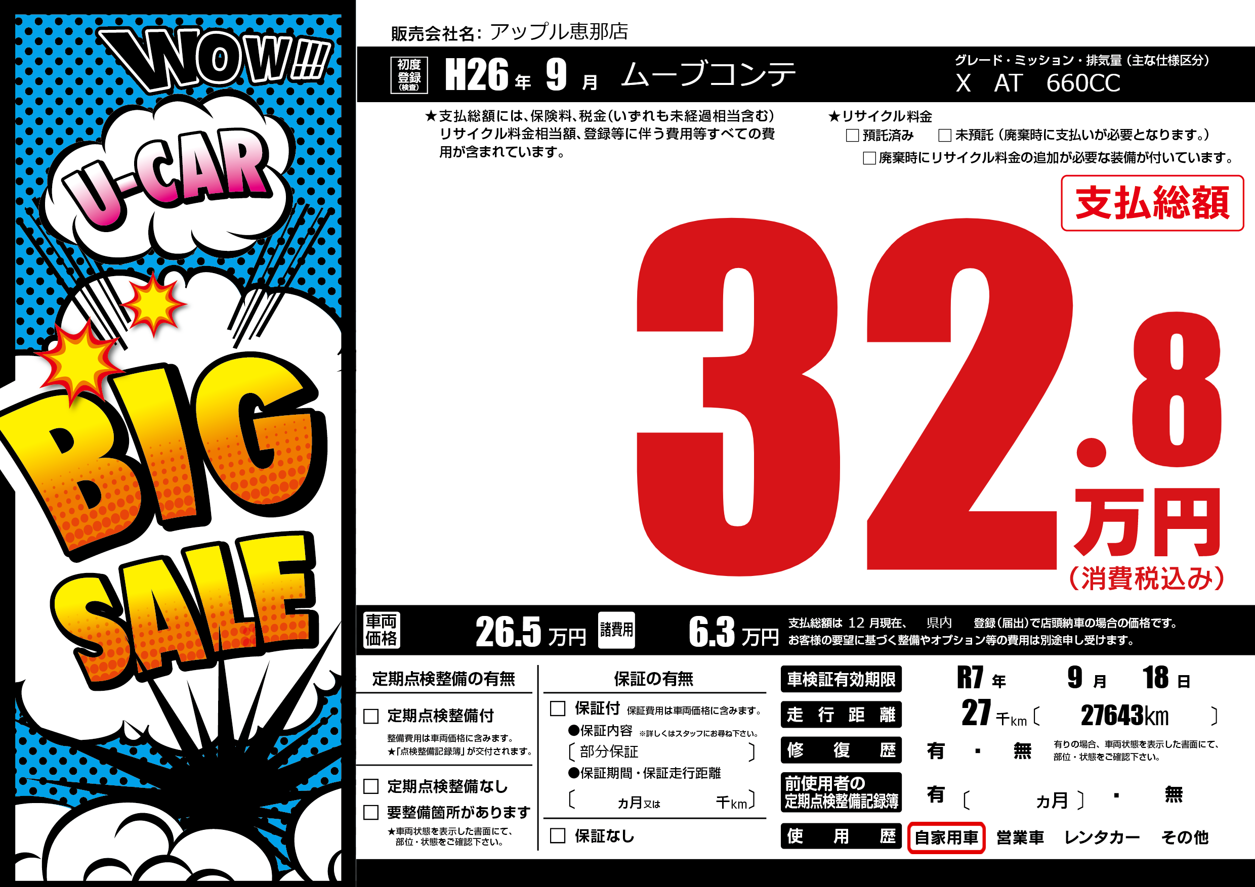 | 走行キロ | 2.7万km | 初年度登録 | H26年9月 |