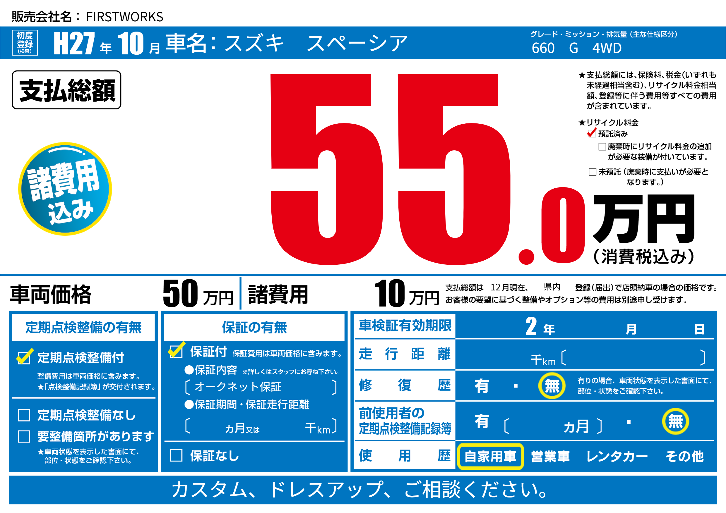 | 車名 | スズキ スペーシア | グレード ミッション 排気量 |