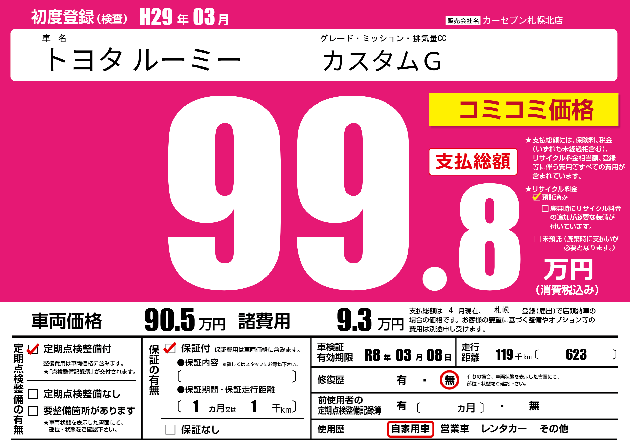 | 車名 | トヨタ ルーミー | グレード ミッション 排気量 |