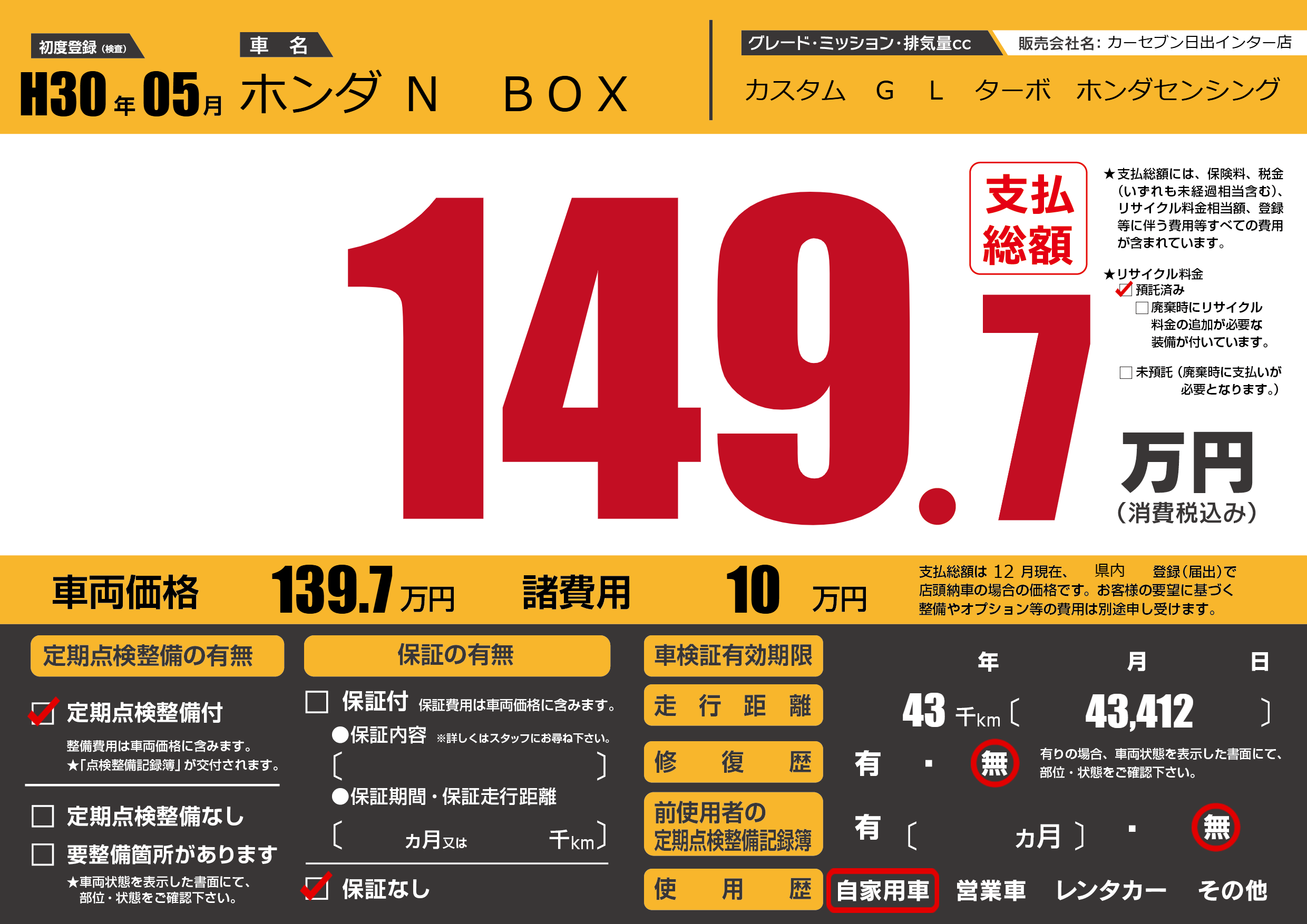 | 走行キロ | 4.3万km | 初年度登録 | H30年05月 |