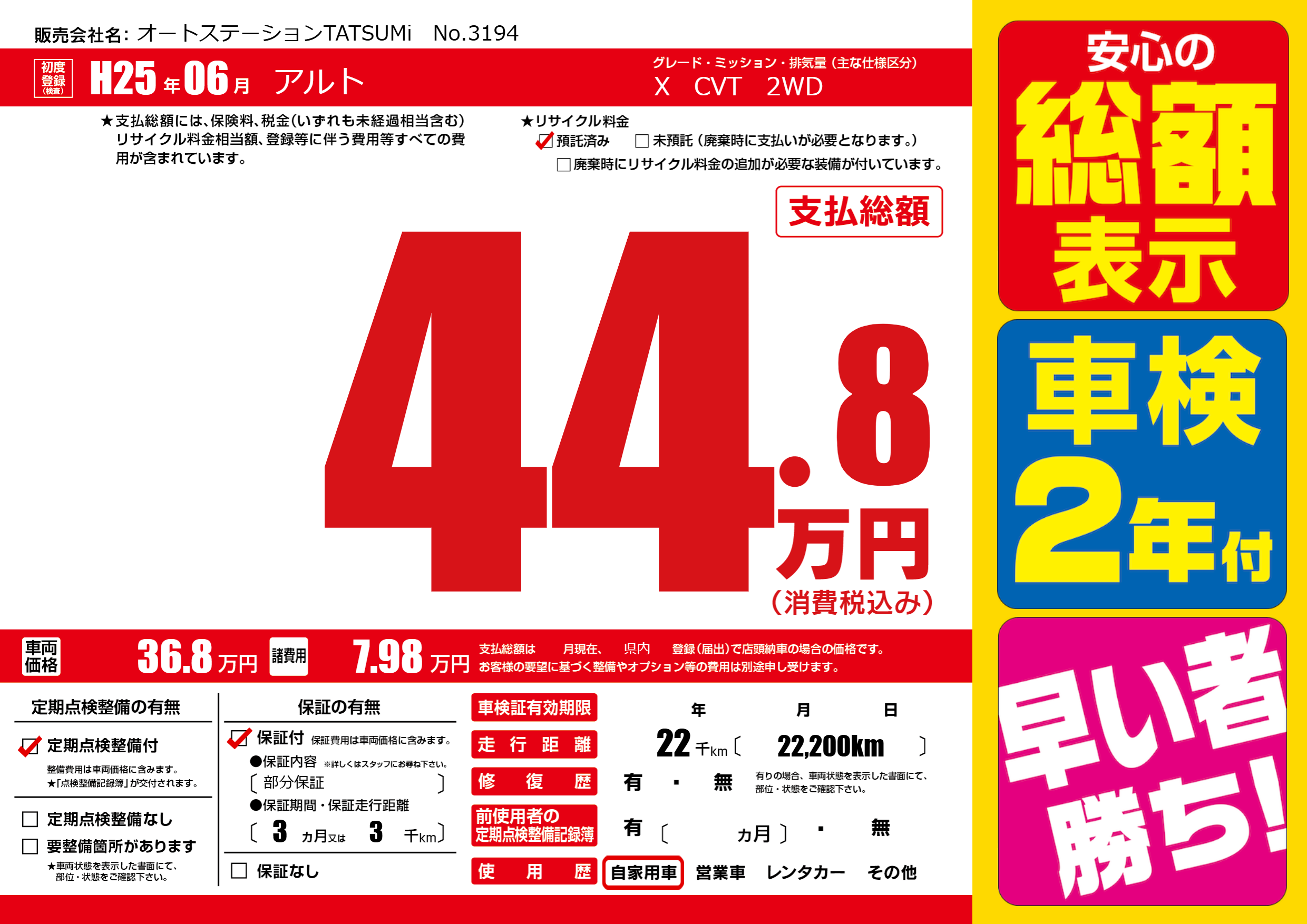 | 走行キロ | 2.2万km | 初年度登録 | H25年06月 |