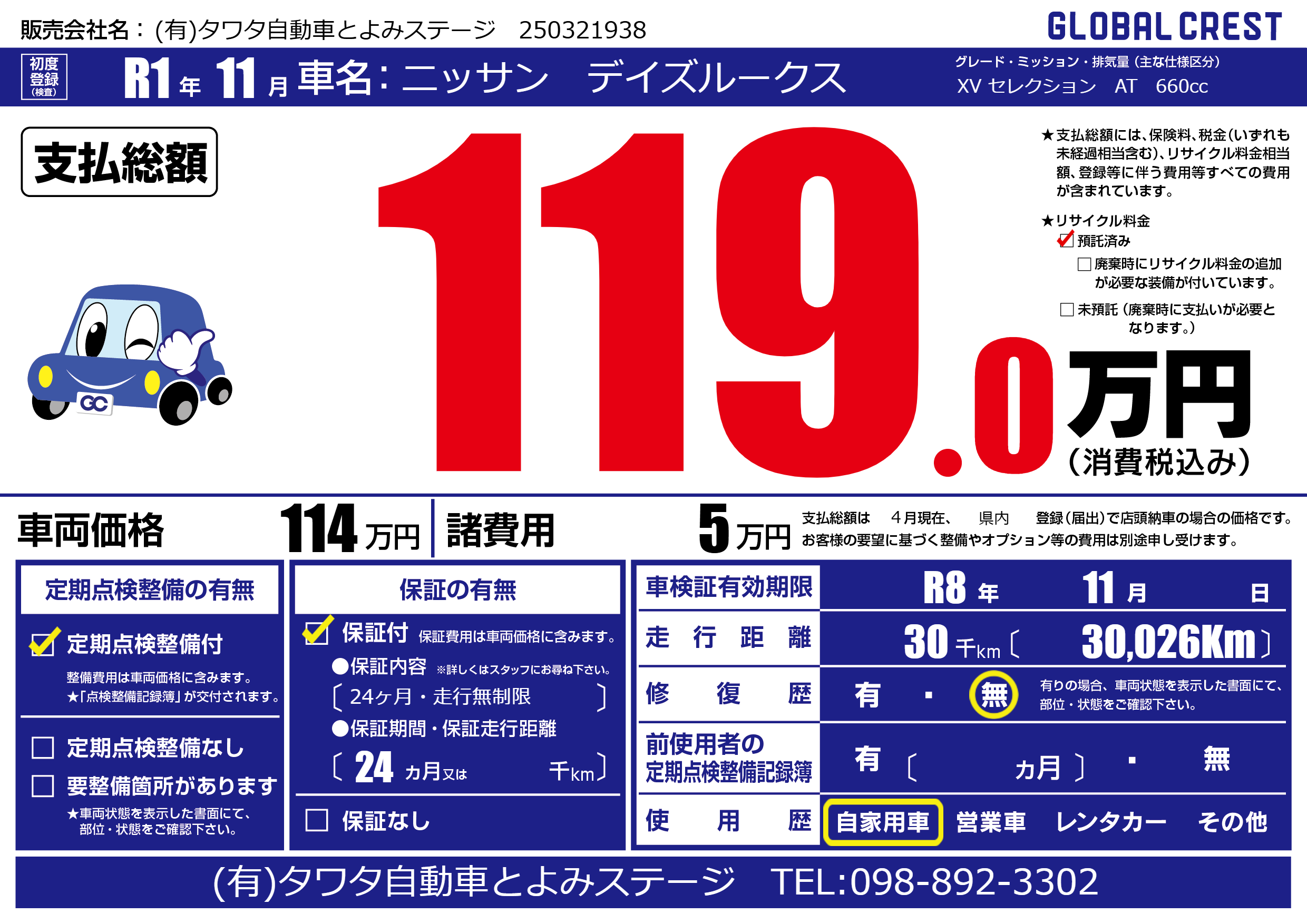 | 走行キロ | 3万km | 初年度登録 | R1年11月 |