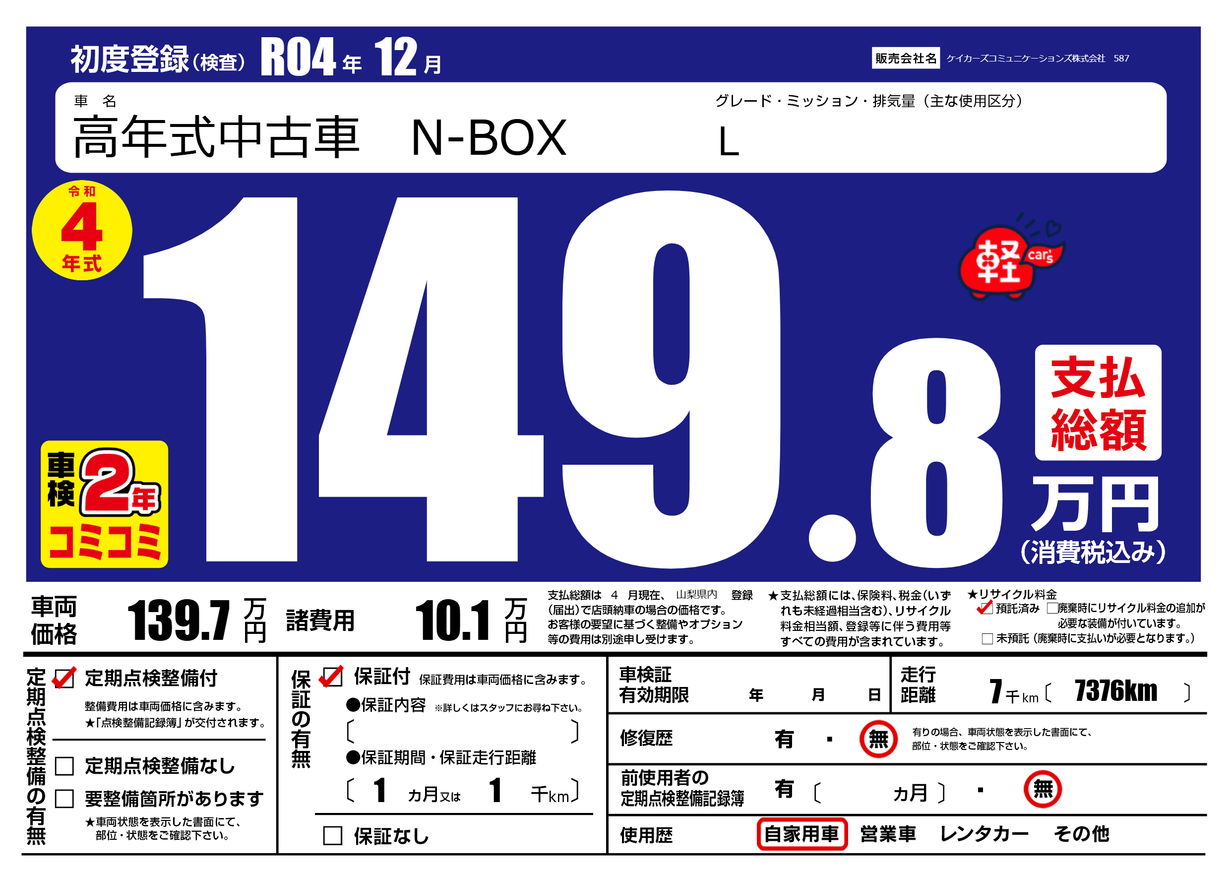 | 走行キロ | 0.7万km | 初年度登録 | R04年12月 |