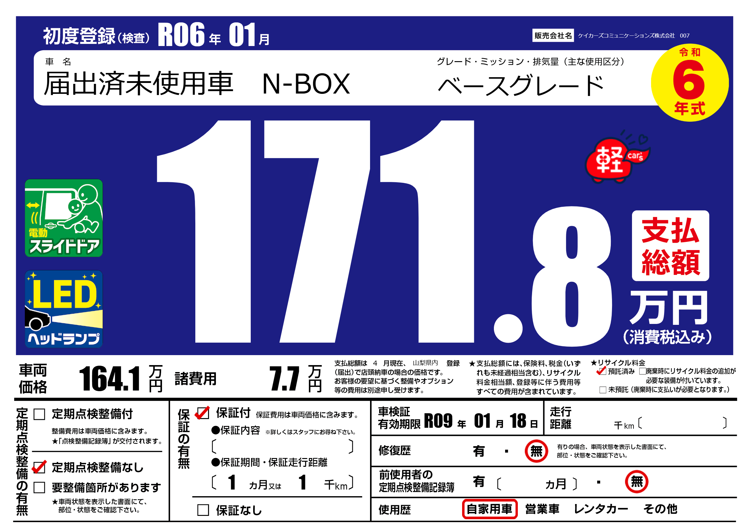 | 走行キロ | - | 初年度登録 | R06年01月 |