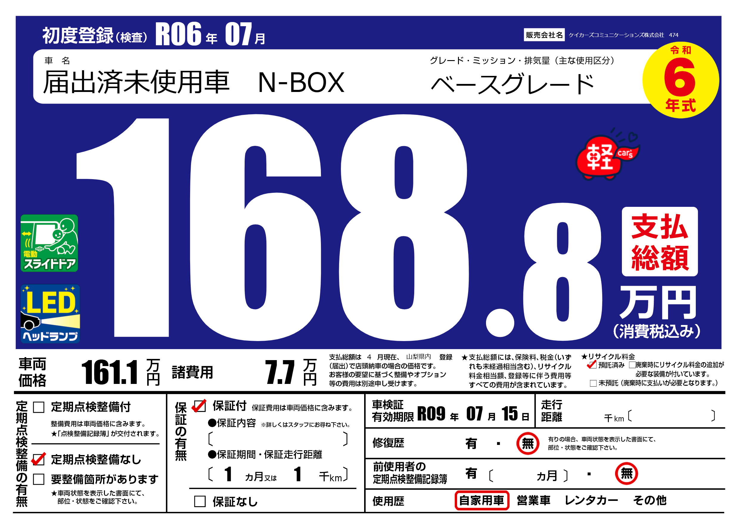 | 車名 | 届出済未使用車 N-BOX | グレード ミッション 排気量 |