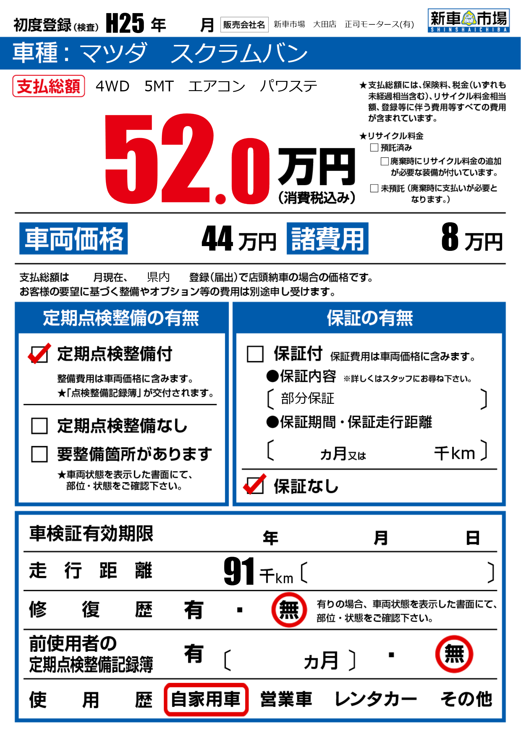 | 車名 | マツダ スクラムバン | グレード ミッション 排気量 |