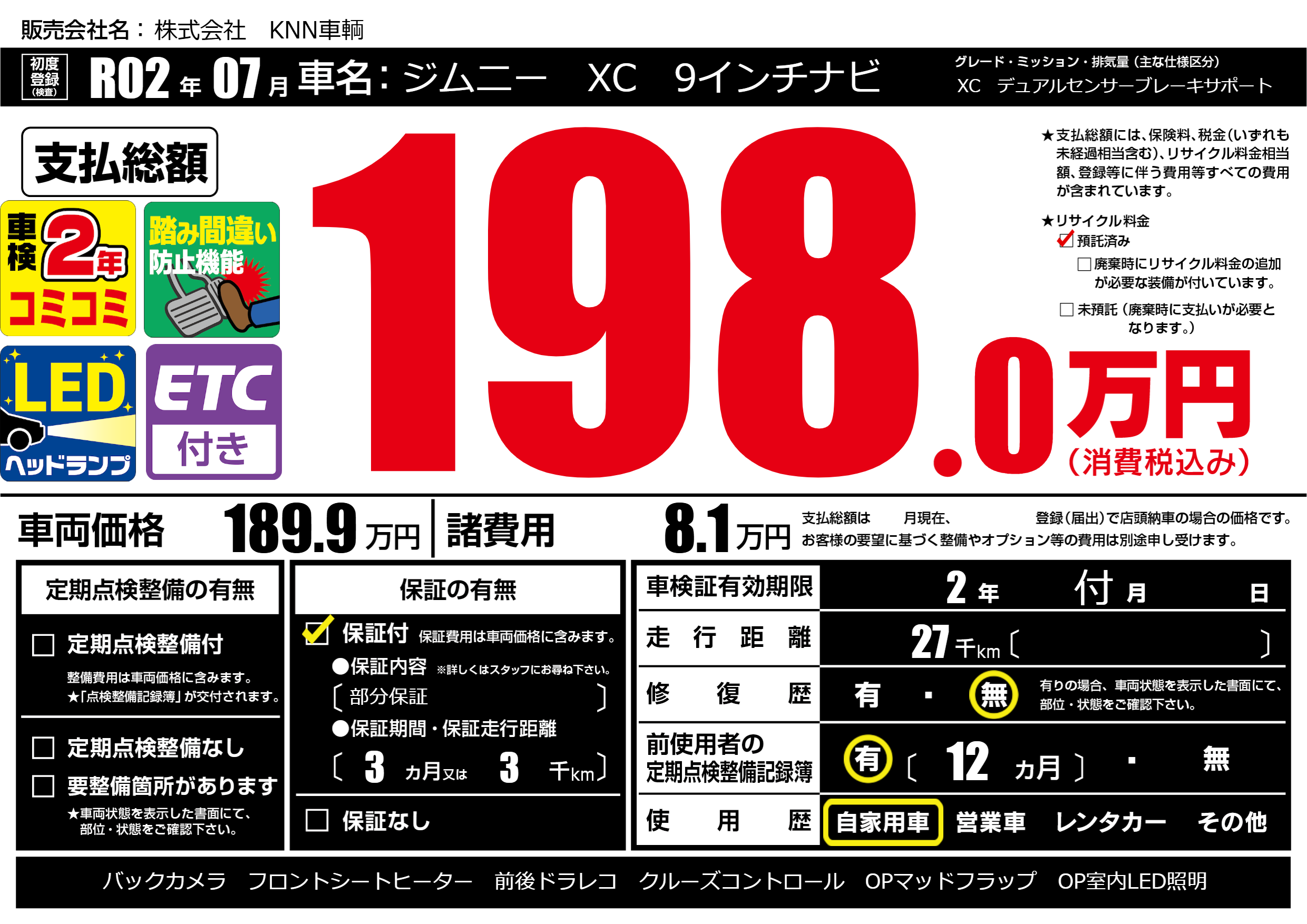 | 車名 | ジムニー XC 9インチナビ | グレード ミッション 排気量 |