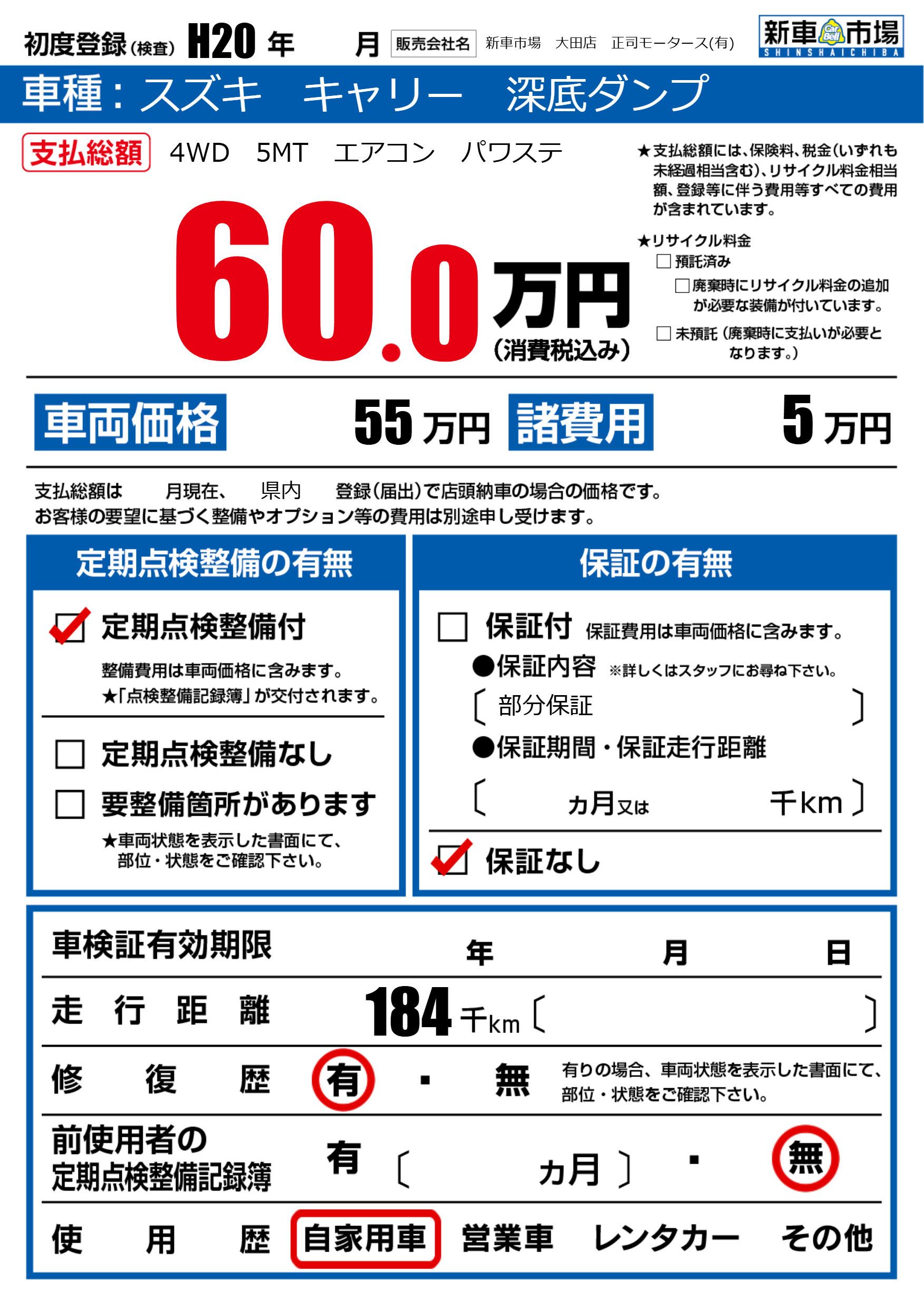 | 車名 | スズキ キャリー 深底ダンプ | グレード ミッション 排気量 |