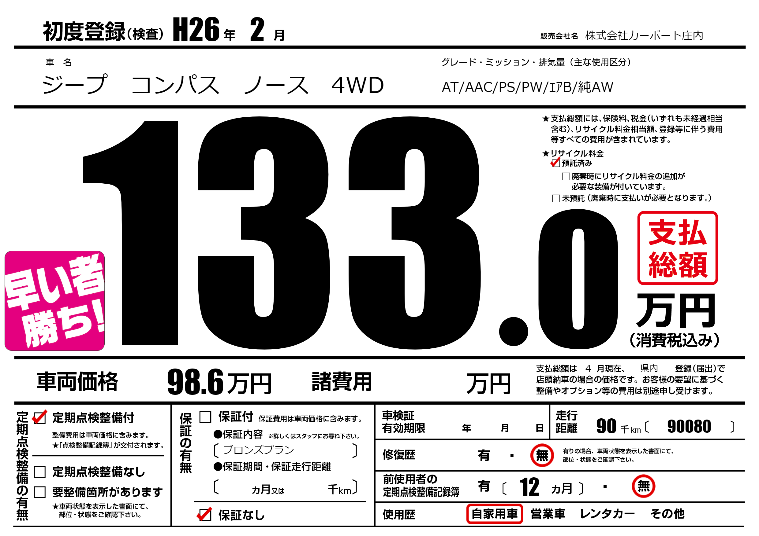 | 走行キロ | 9万km | 初年度登録 | H26年2月 |