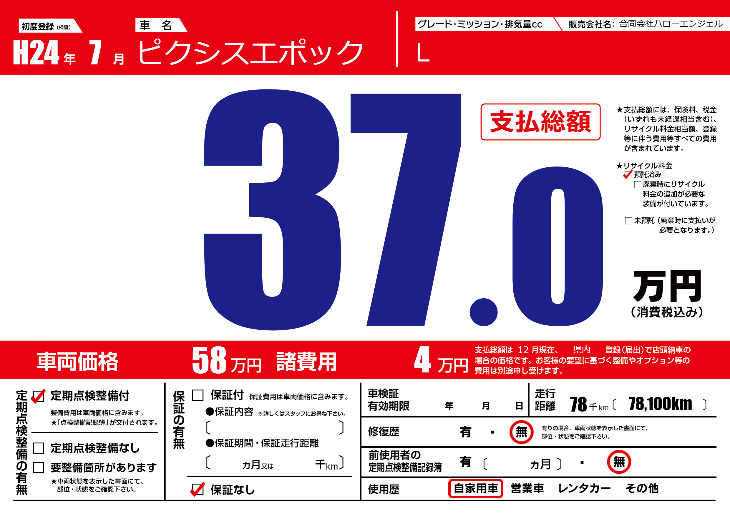 | 走行キロ | 7.8万km | 初年度登録 | H24年7月 |