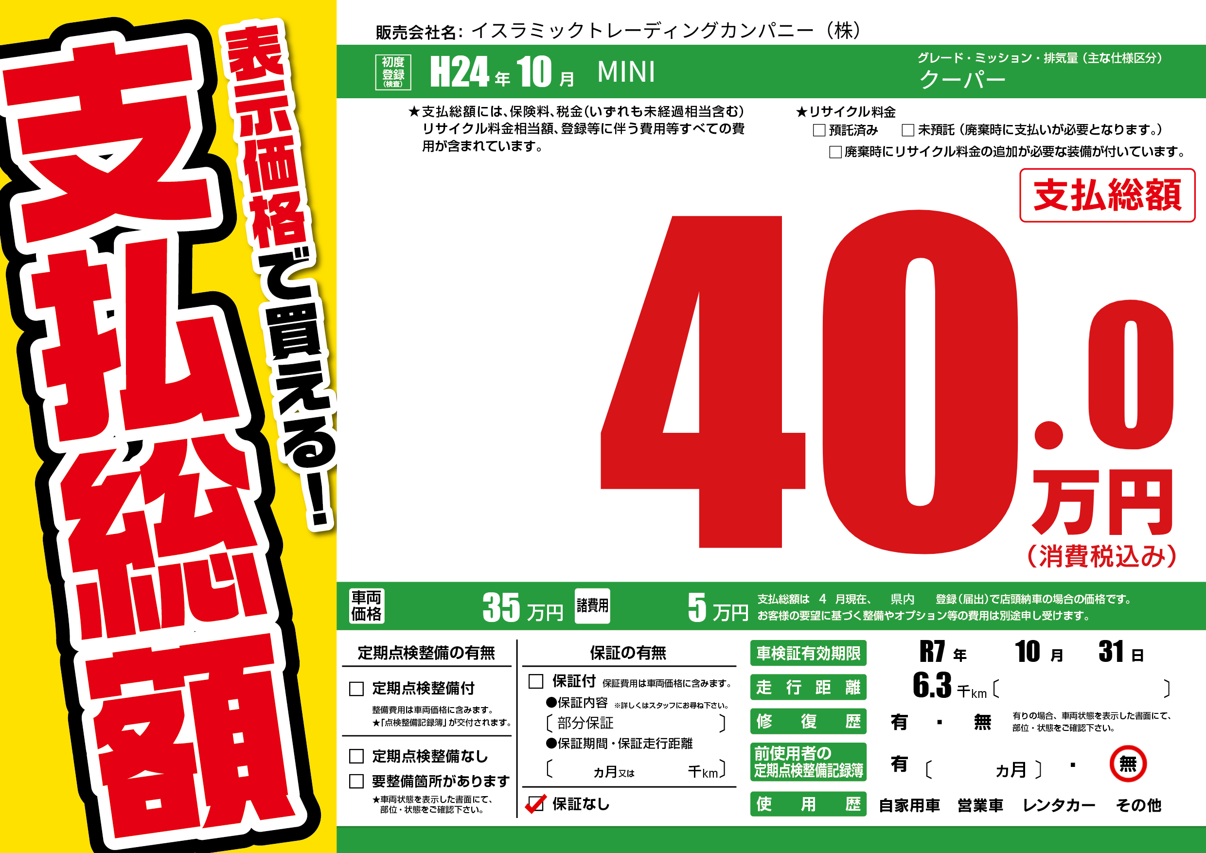 | 走行キロ | 0.6万km | 初年度登録 | H24年10月 |