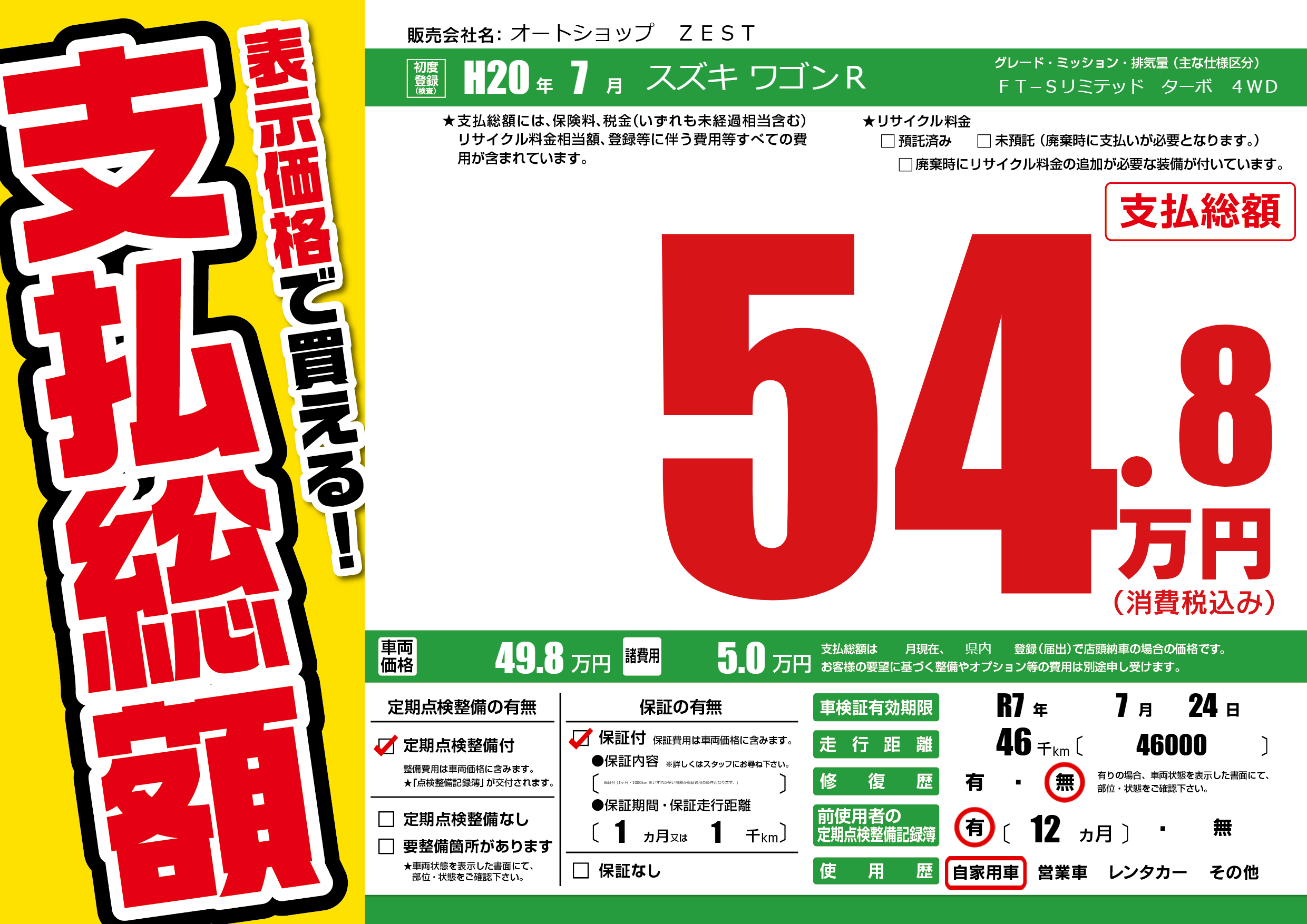 | 走行キロ | 4.6万km | 初年度登録 | H20年7月 |