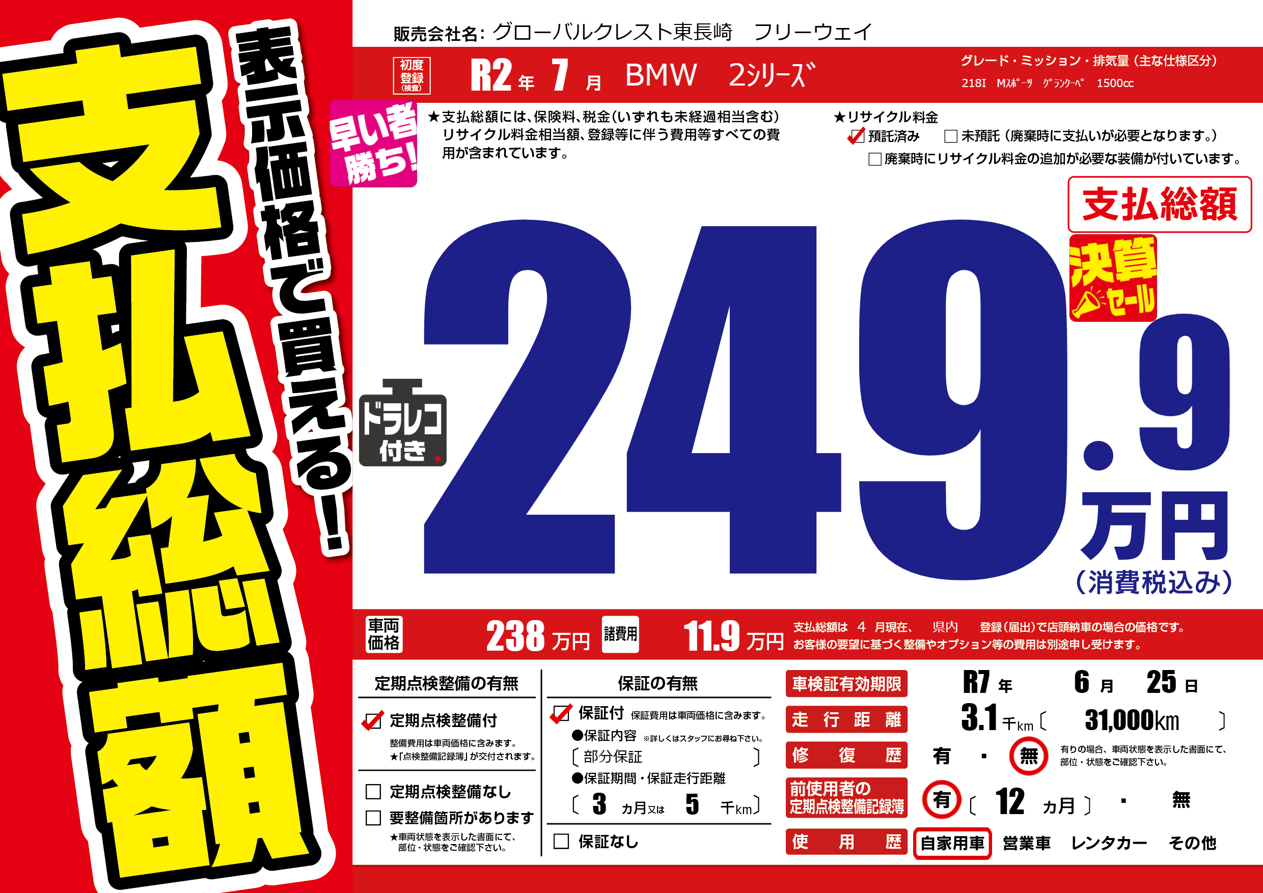 | 車名 | BMW 2シリーズ | グレード ミッション 排気量 |
