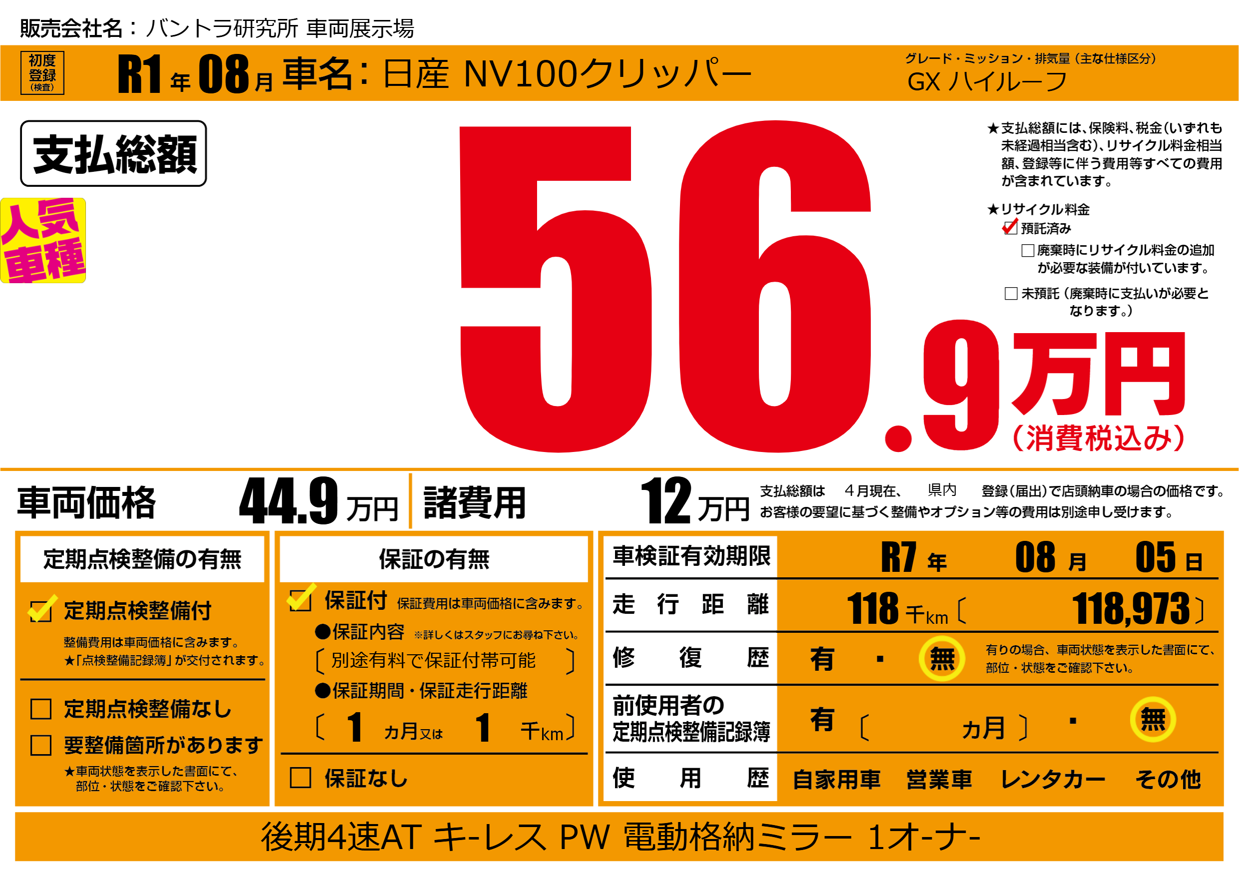 | 車検制限 | R7年 08月 05日 | ||