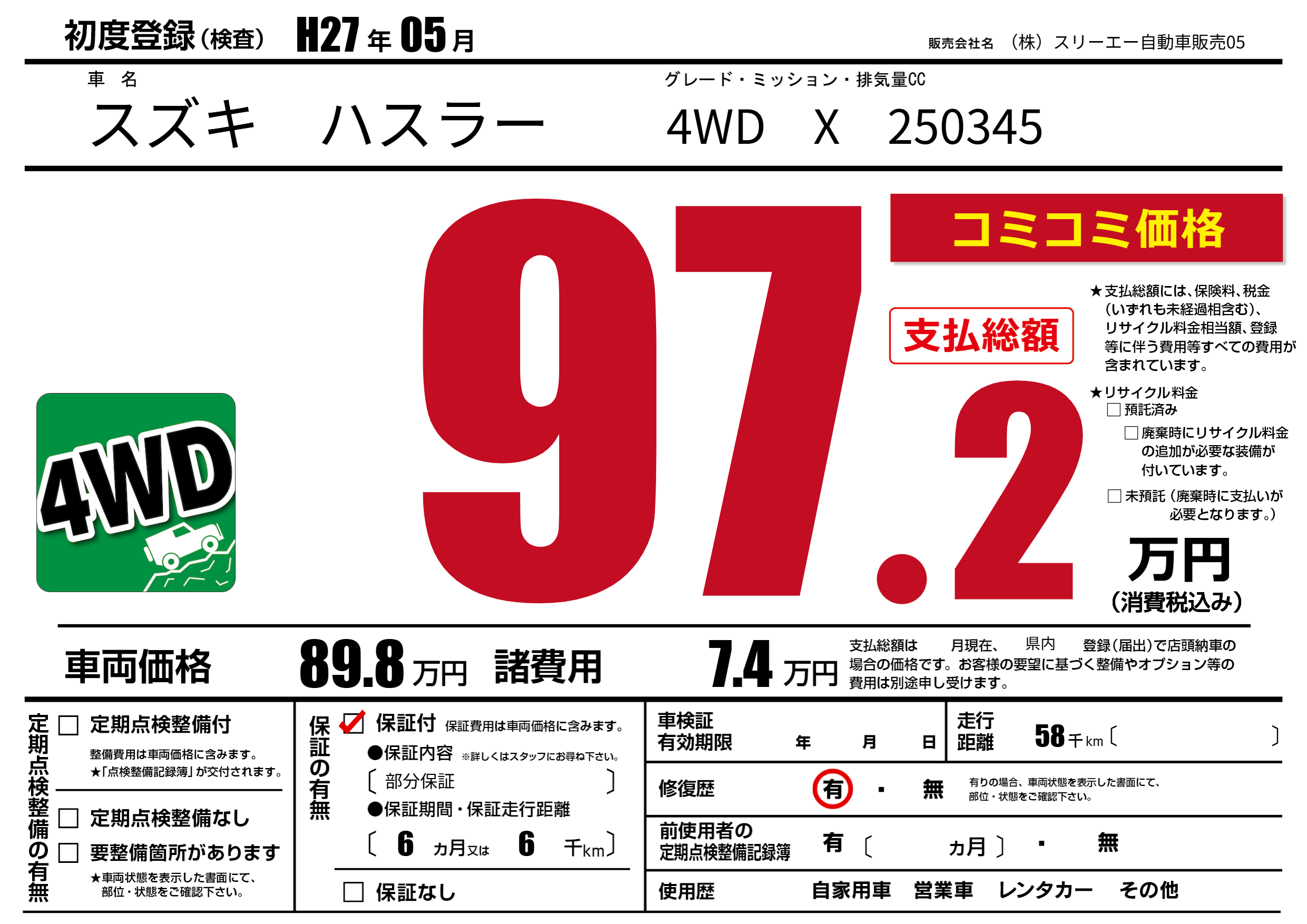 | 車名 | スズキ ハスラー | グレード ミッション 排気量 |