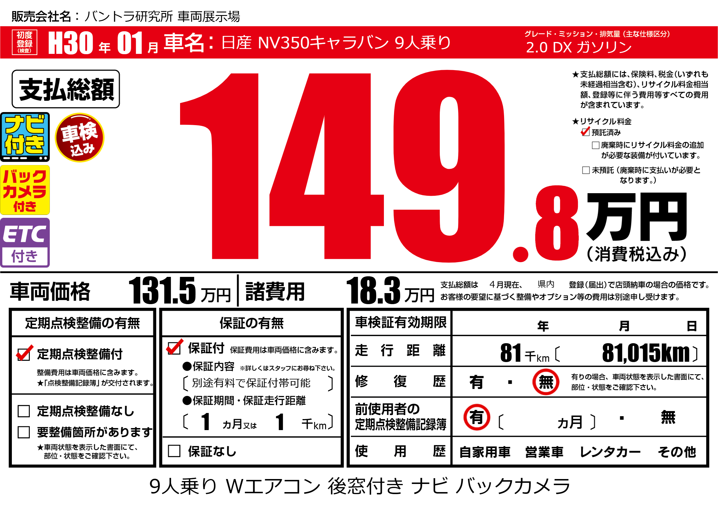 | 車名 | 日産 NV350キャラバン 9人乗り | グレード ミッション 排気量 |