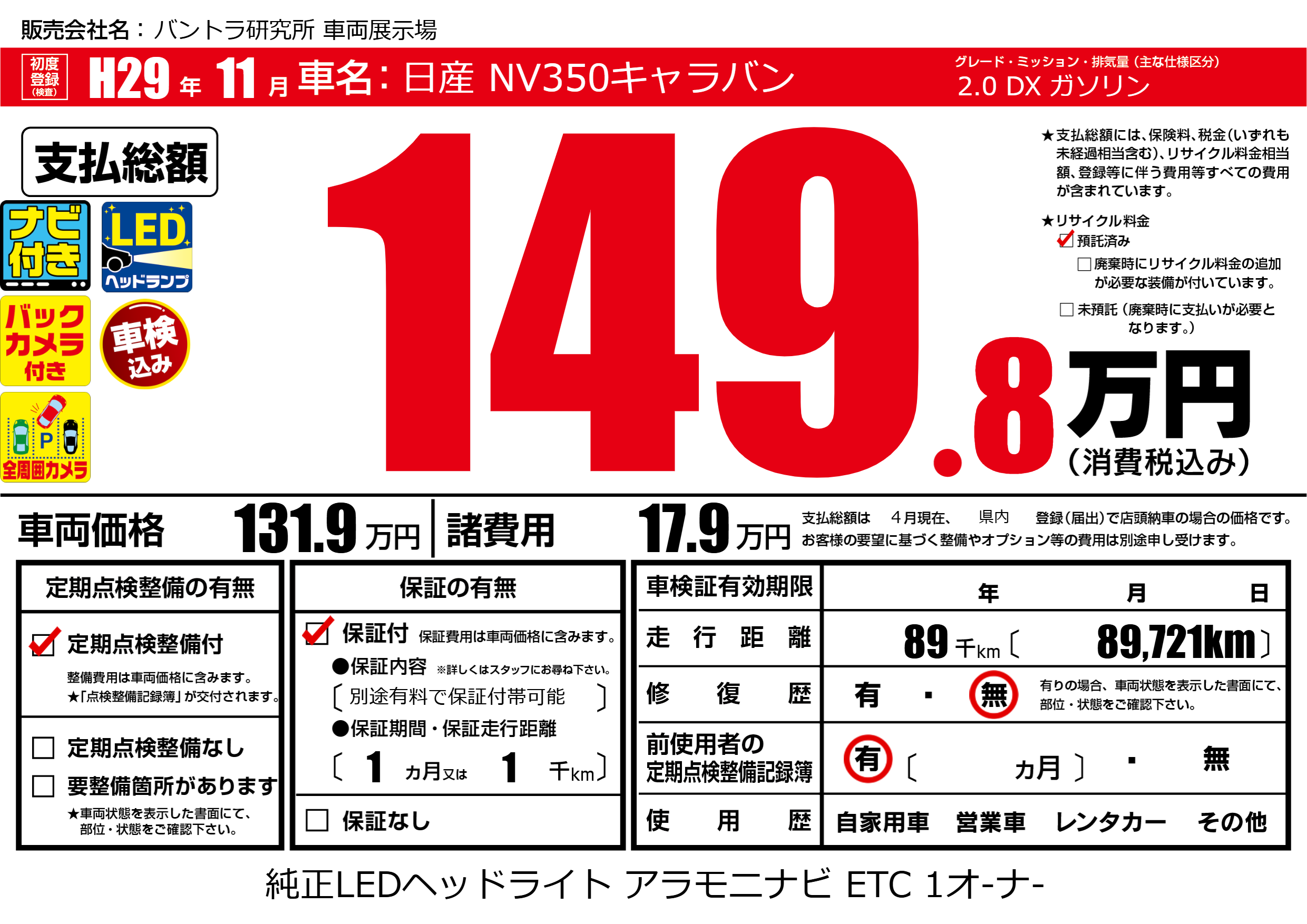 | 車名 | 日産 NV350キャラバン | グレード ミッション 排気量 |