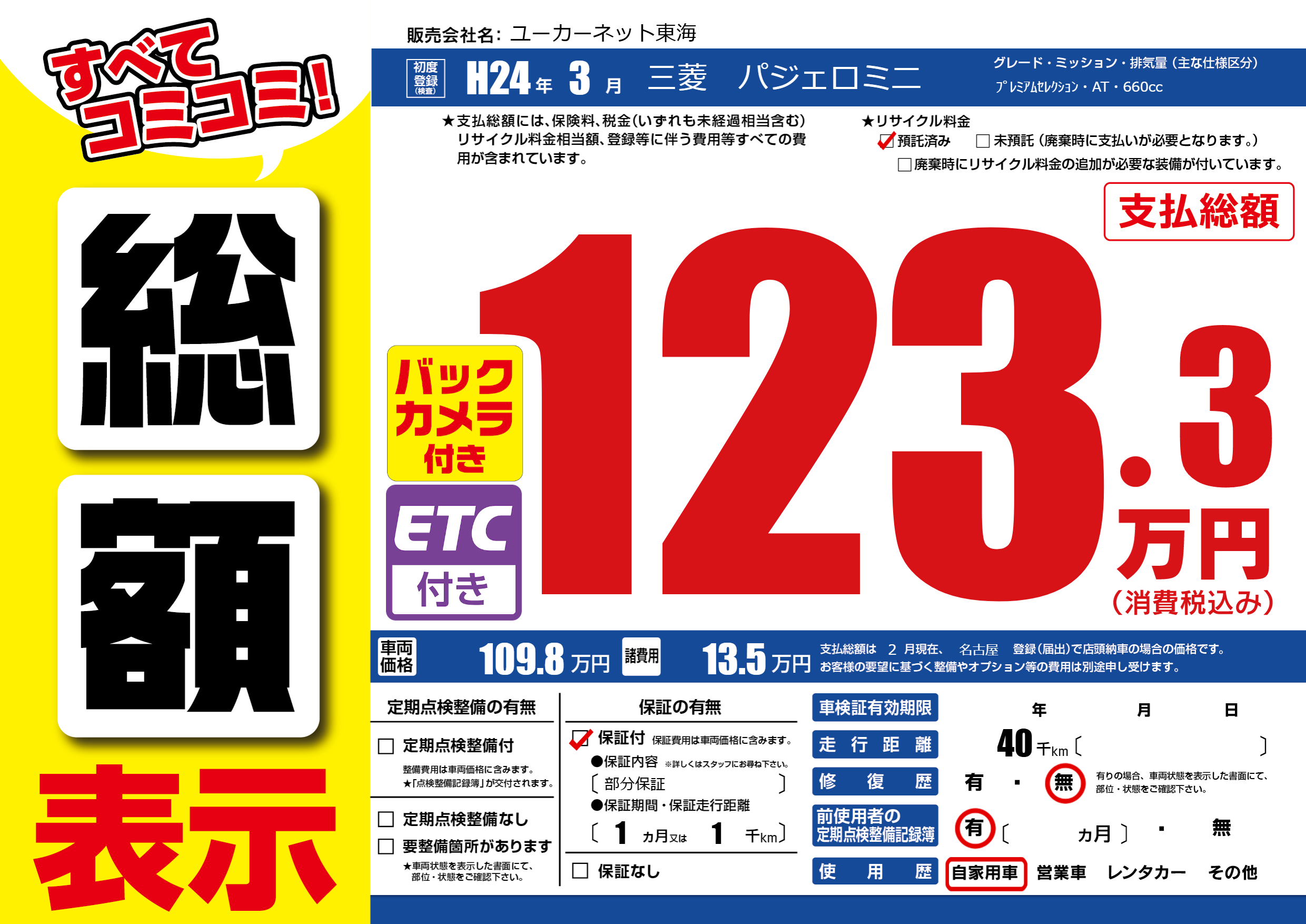 | 車名 | 三菱 パジェロミニ | グレード ミッション 排気量 |