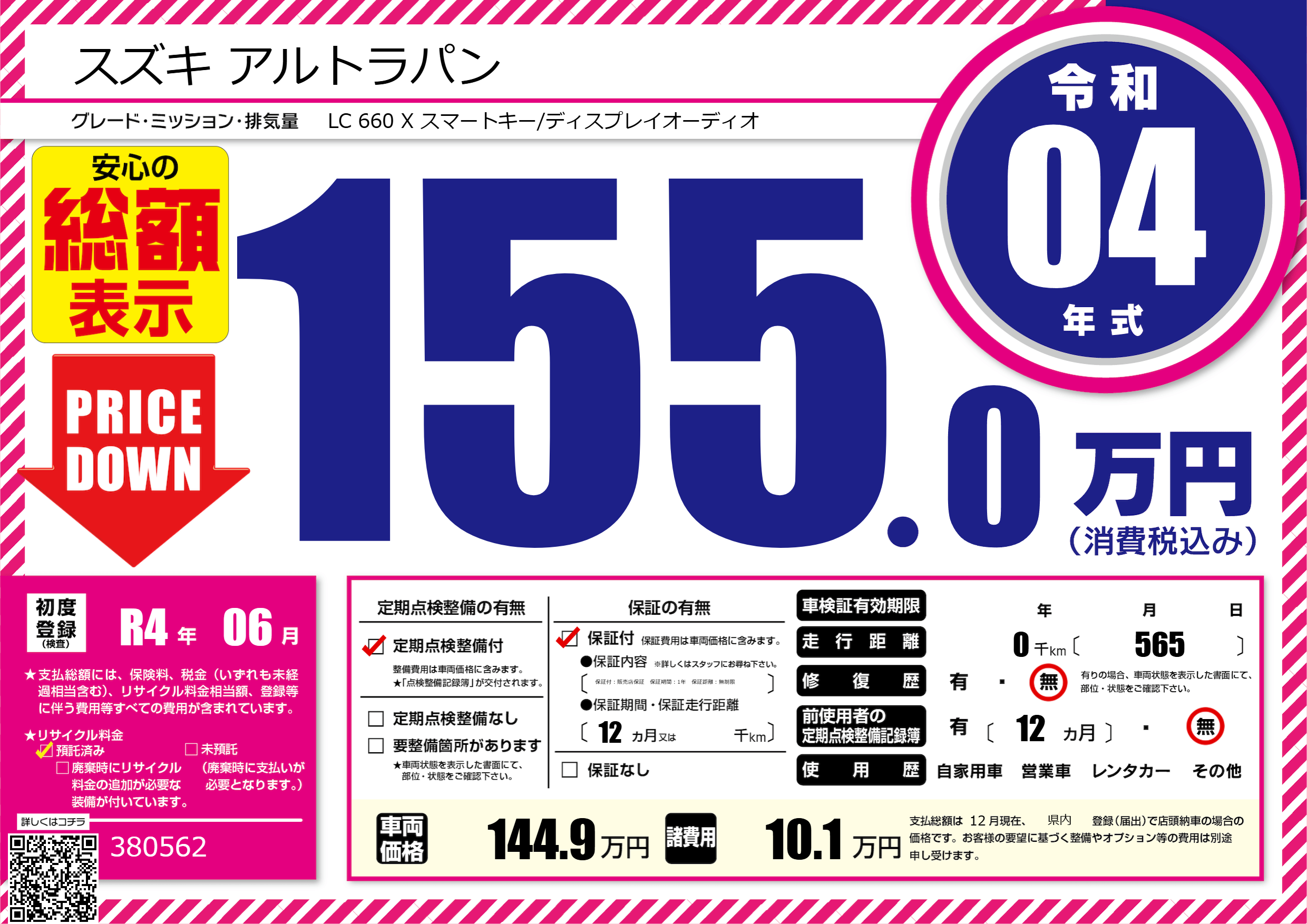 | 走行キロ | - | 初年度登録 | R4年06月 |