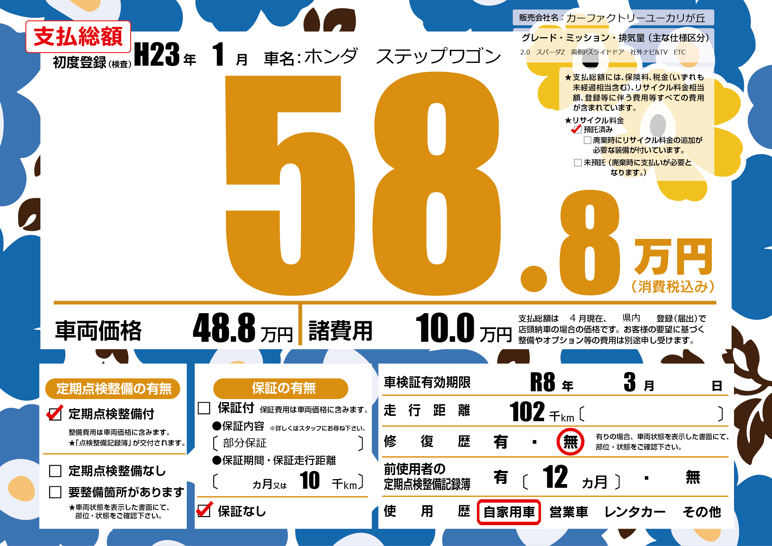 | 走行キロ | 10.2万km | 初年度登録 | H23年1月 |