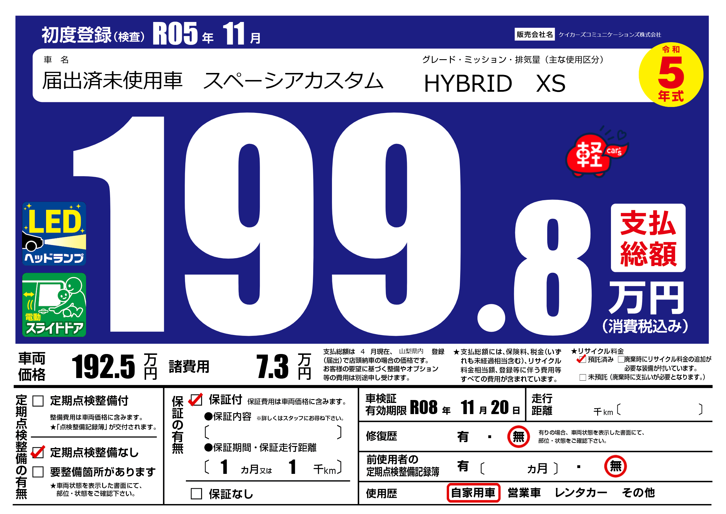 | 走行キロ | - | 初年度登録 | R05年11月 |