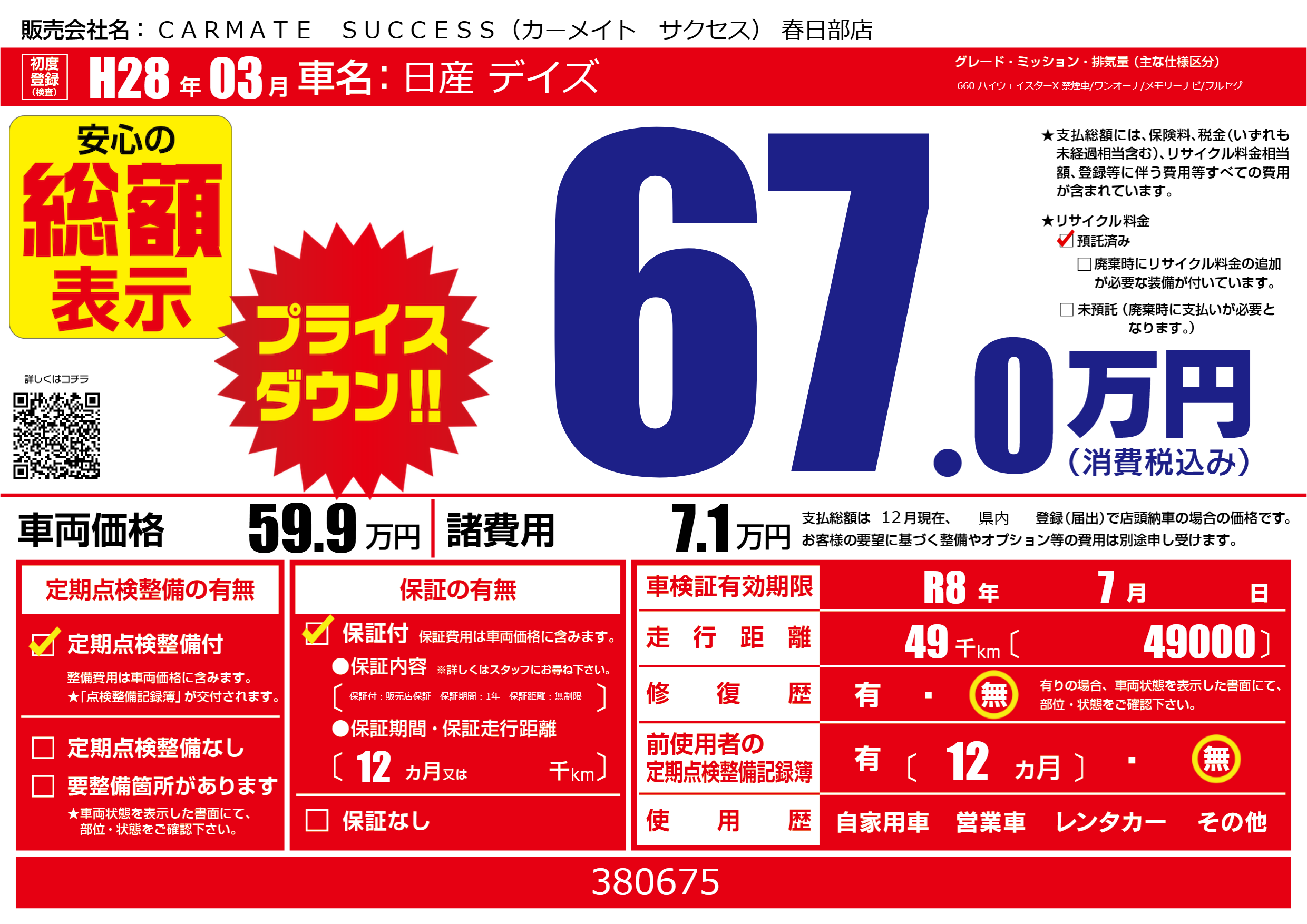 | 車検制限 | R8年 7月 - 日 | ||