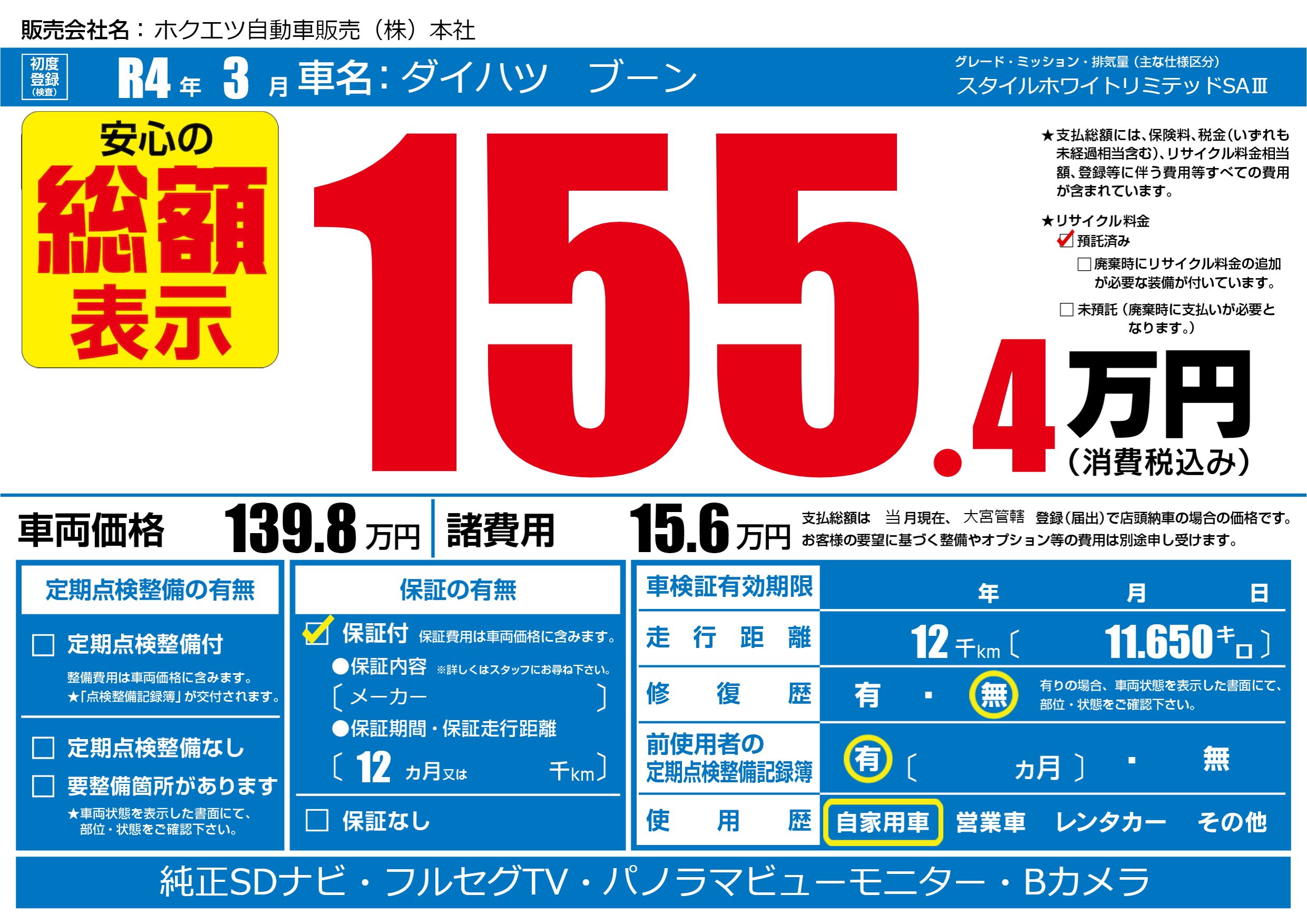 | 車名 | ダイハツ ブーン | グレード ミッション 排気量 |