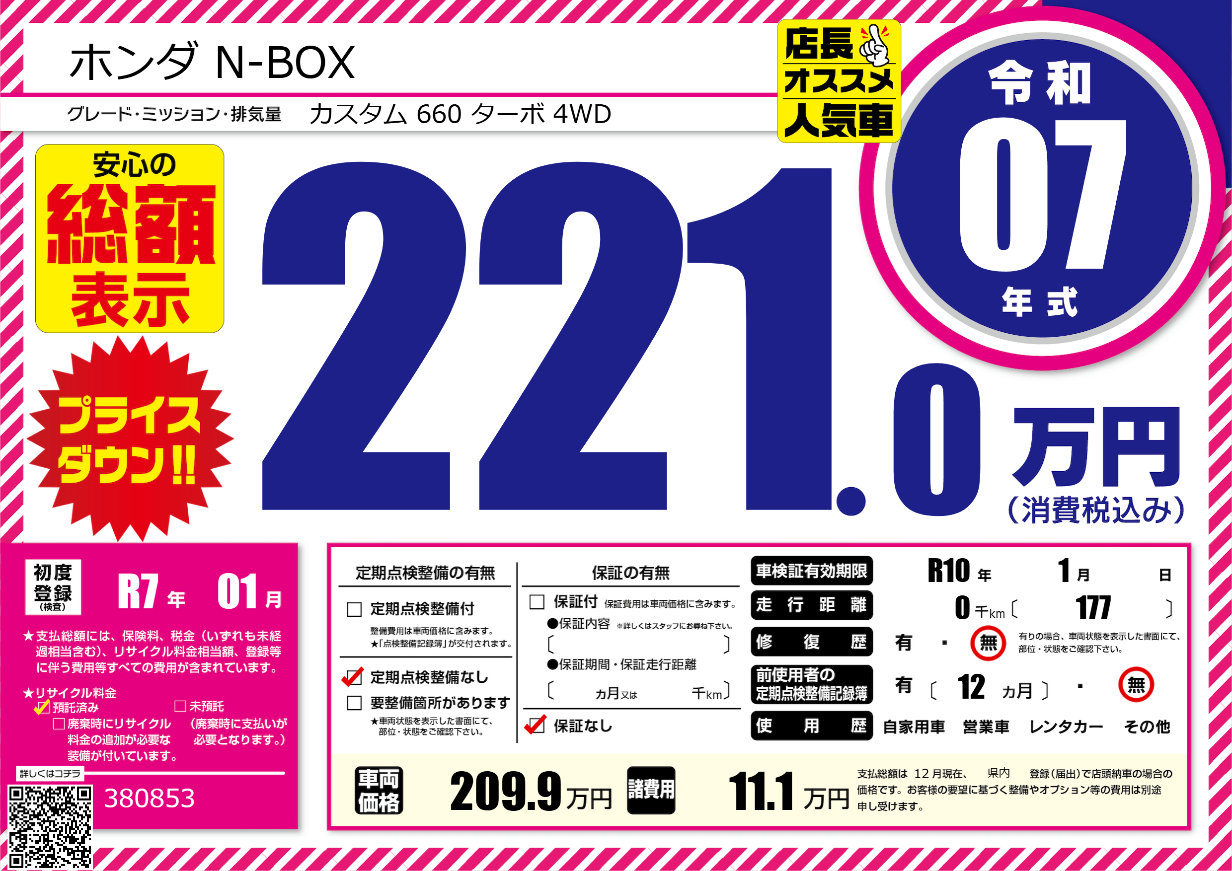 | 走行キロ | - | 初年度登録 | R7年01月 |