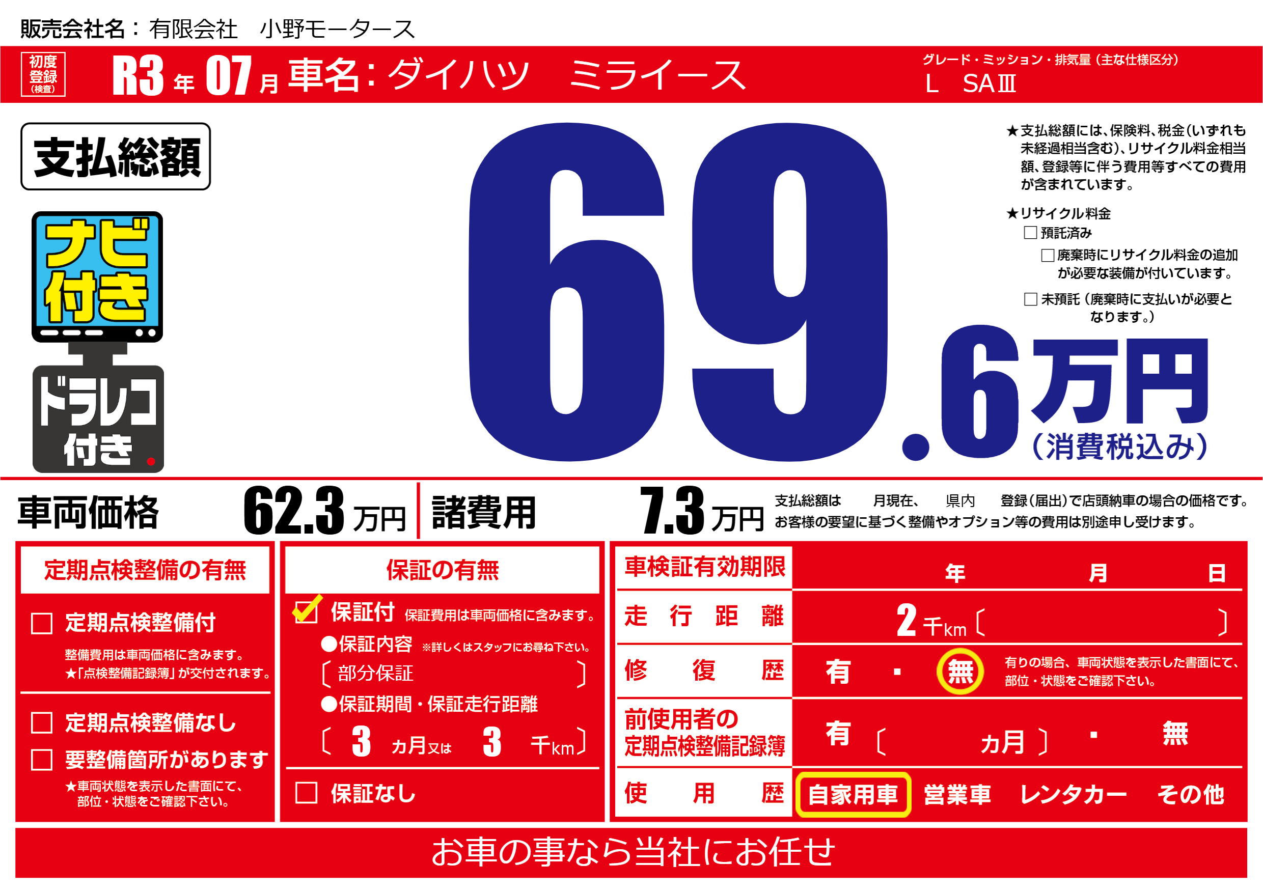 | 走行キロ | 0.2万km | 初年度登録 | R3年07月 |