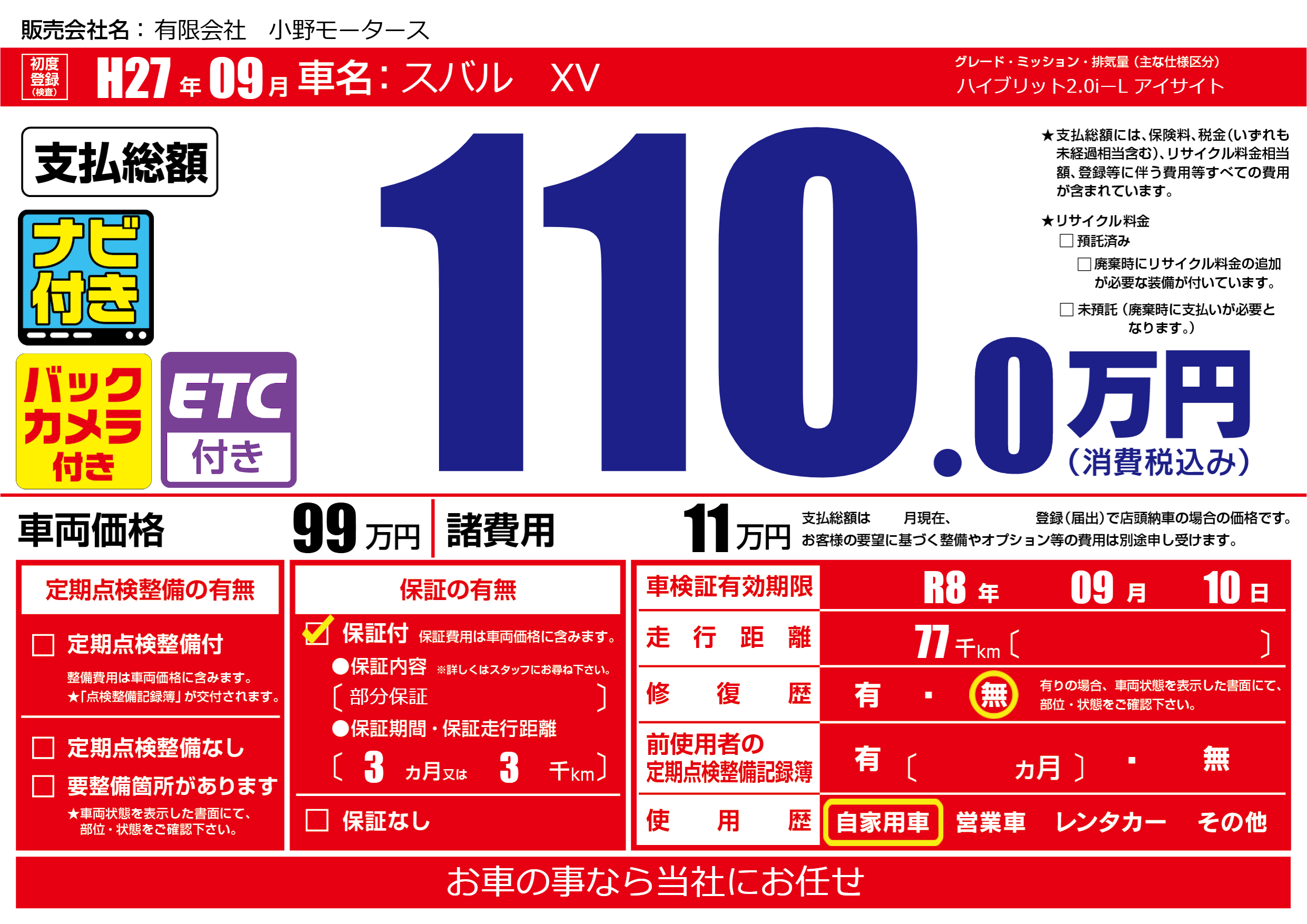 | 車名 | スバル XV | グレード ミッション 排気量 |