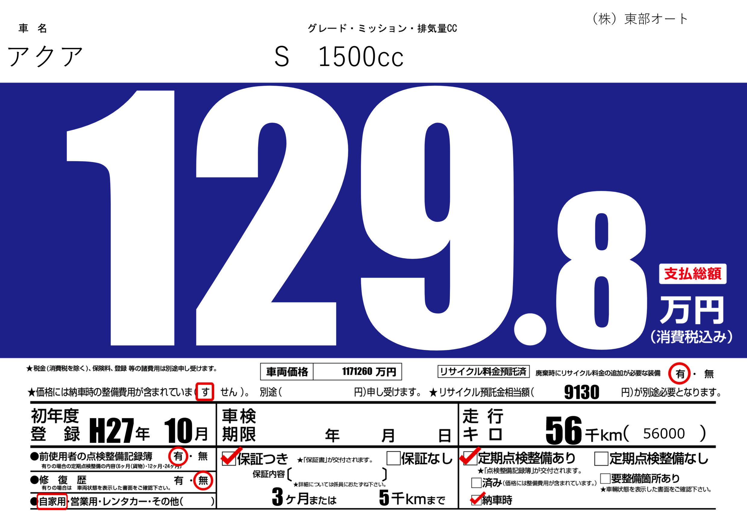 保証付き 保証内容(---) 3ヶ月または(5)千kmまで |