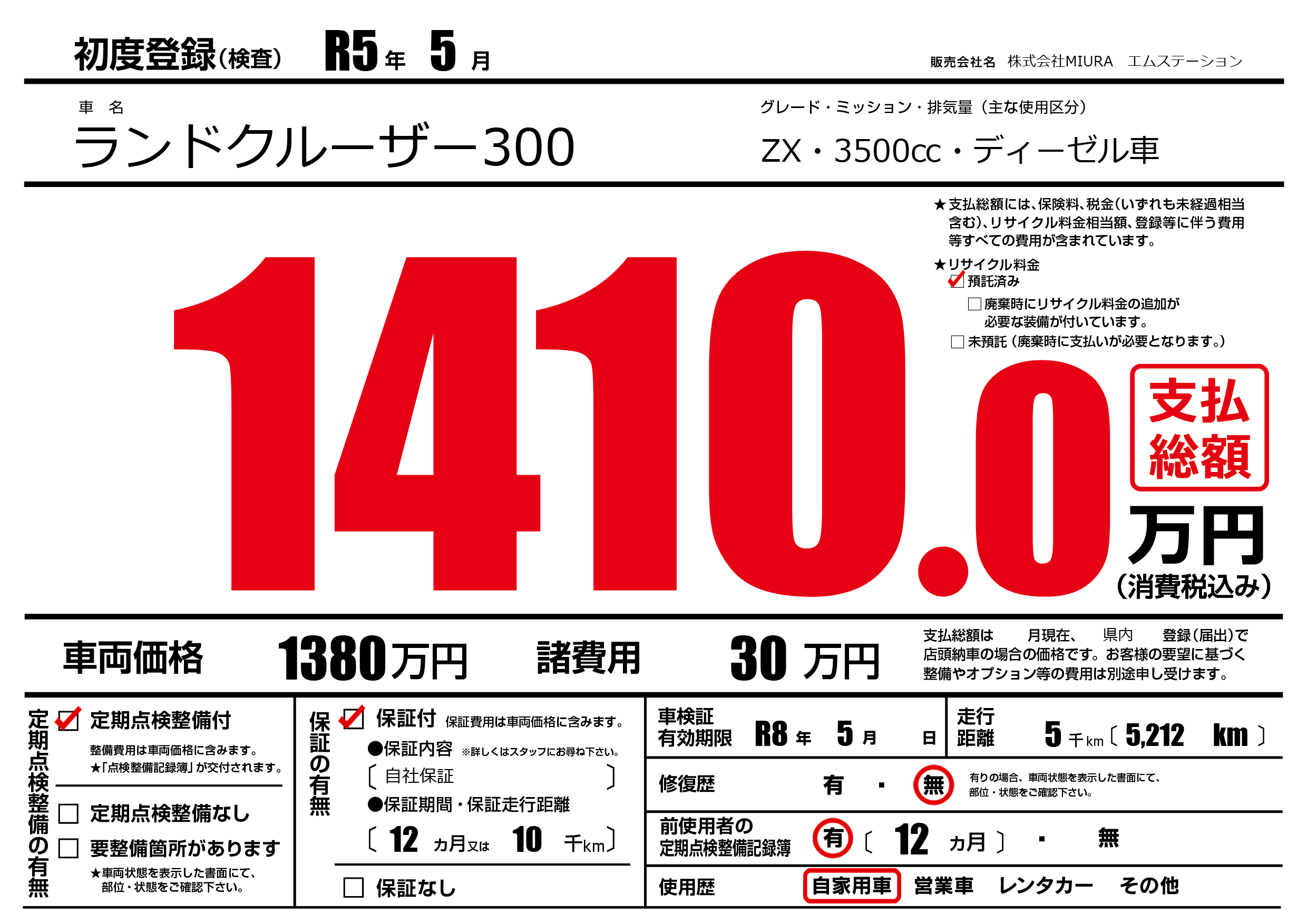| 車名 | ランドクルーザー300 | グレード ミッション 排気量 |