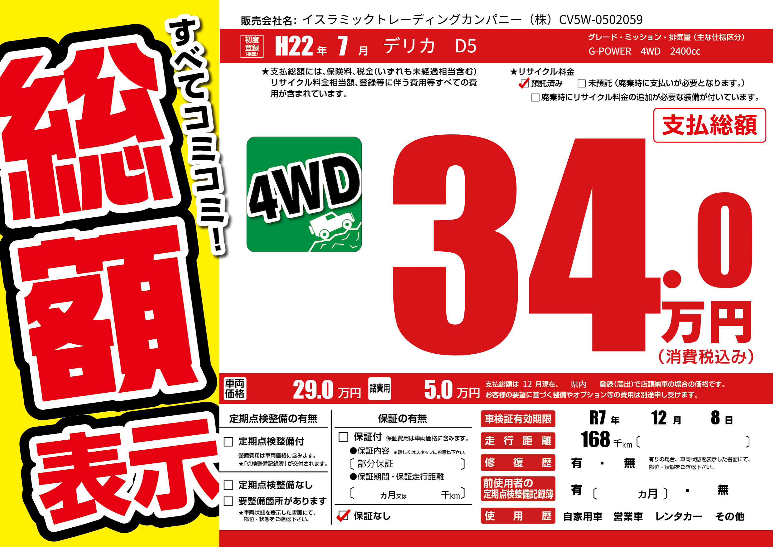 | 車名 | デリカ D5 | グレード ミッション 排気量 |