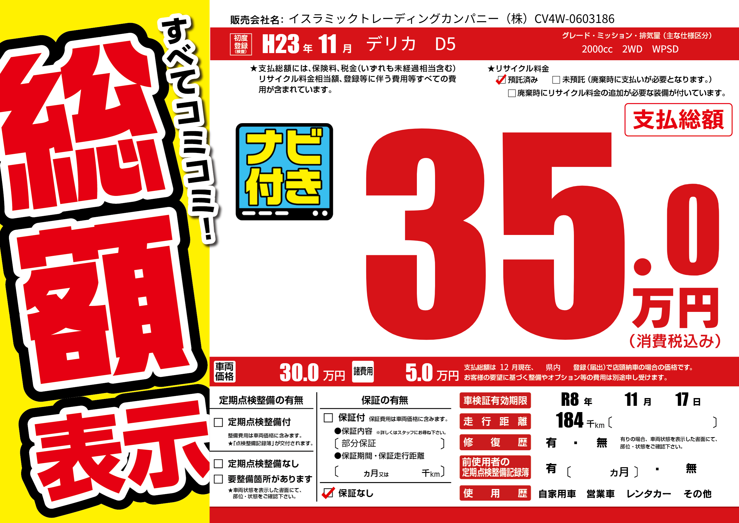 | 走行キロ | 18.4万km | 初年度登録 | H23年11月 |