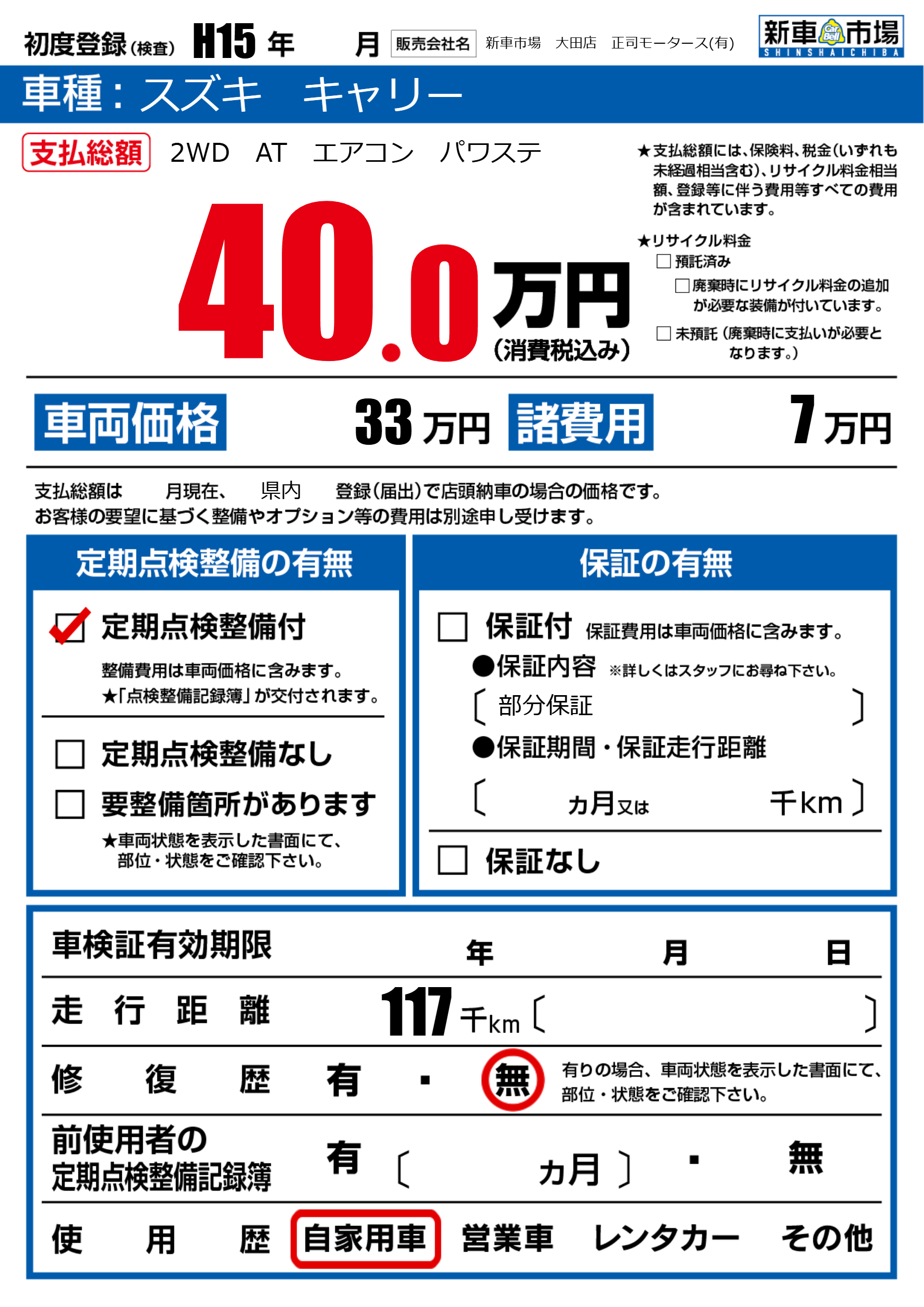 | 車名 | スズキ キャリー | グレード ミッション 排気量 |