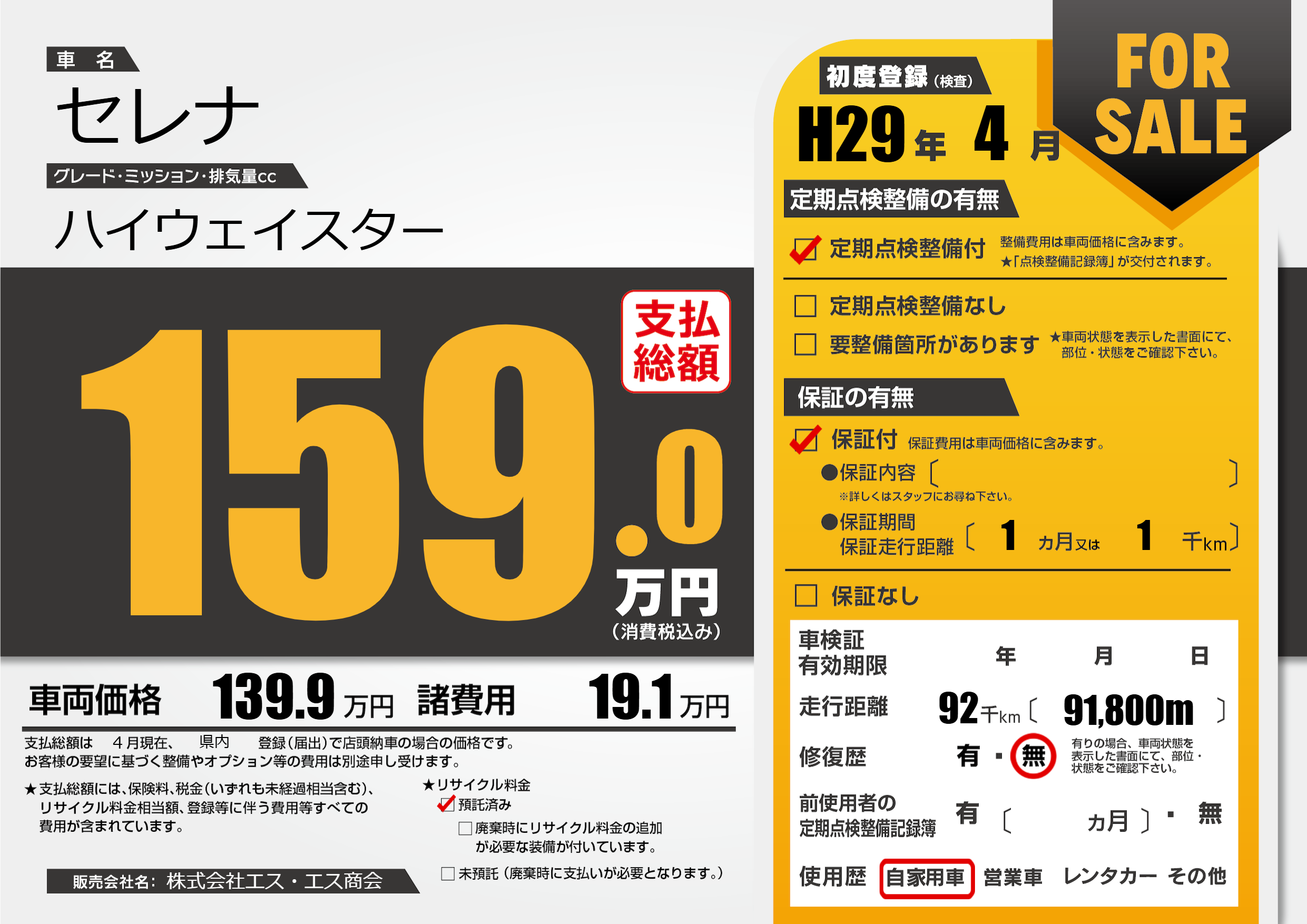 | 走行キロ | 9.2万km | 初年度登録 | H29年4月 |