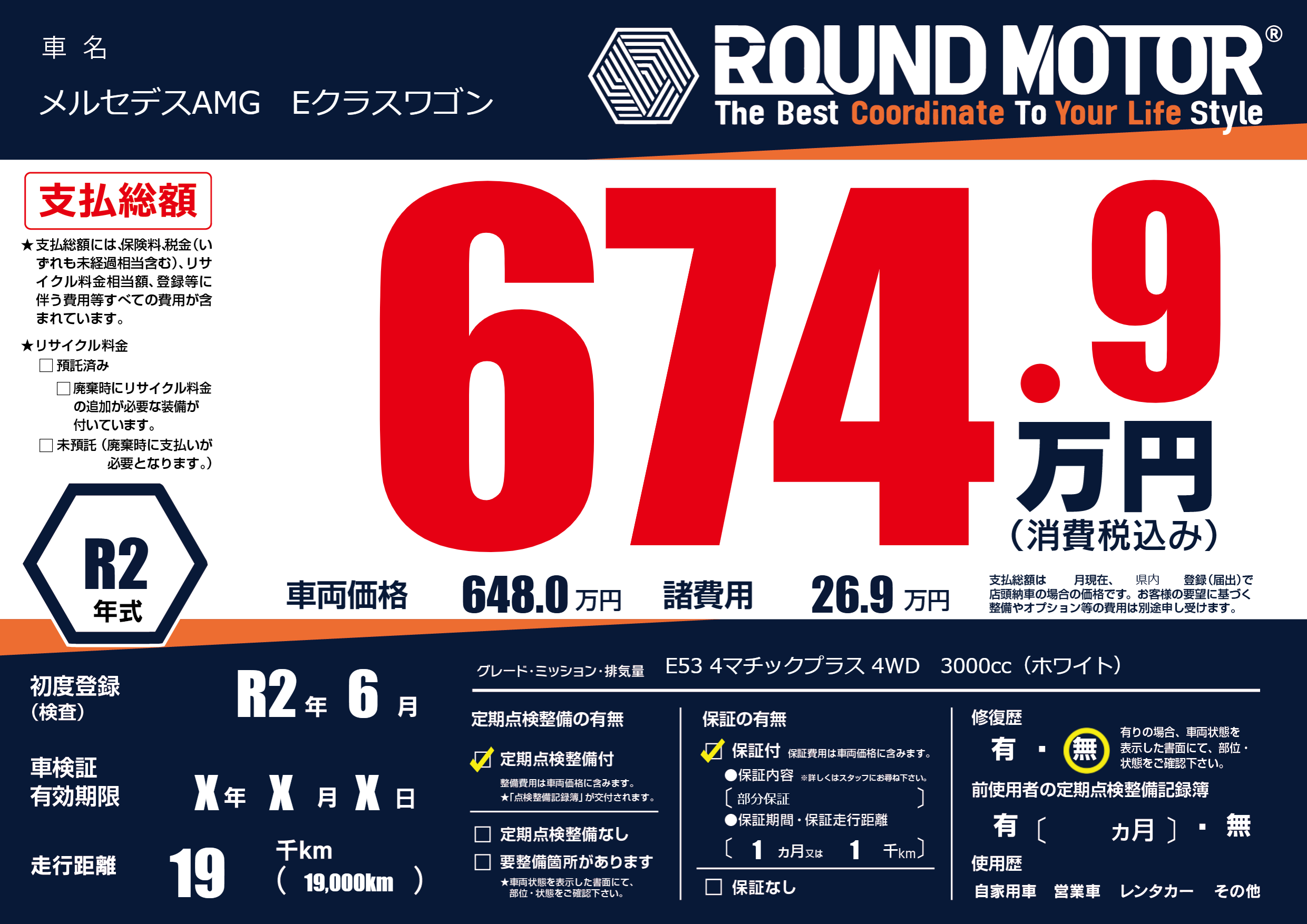 | 車名 | メルセデスAMG Eクラスワゴン | グレード ミッション 排気量 |