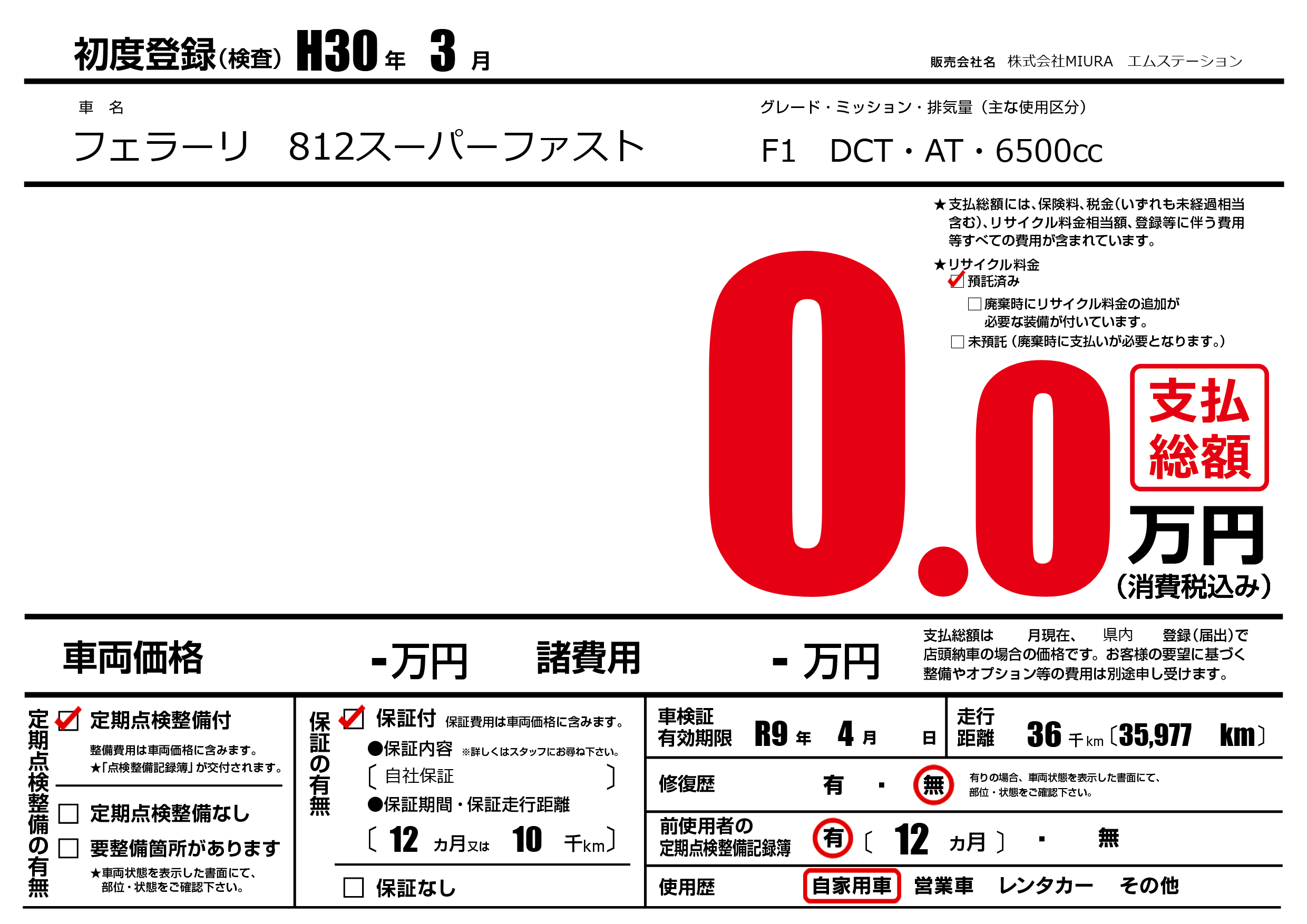| 車名 | フェラーリ 812スーパーファスト | グレード ミッション 排気量 |