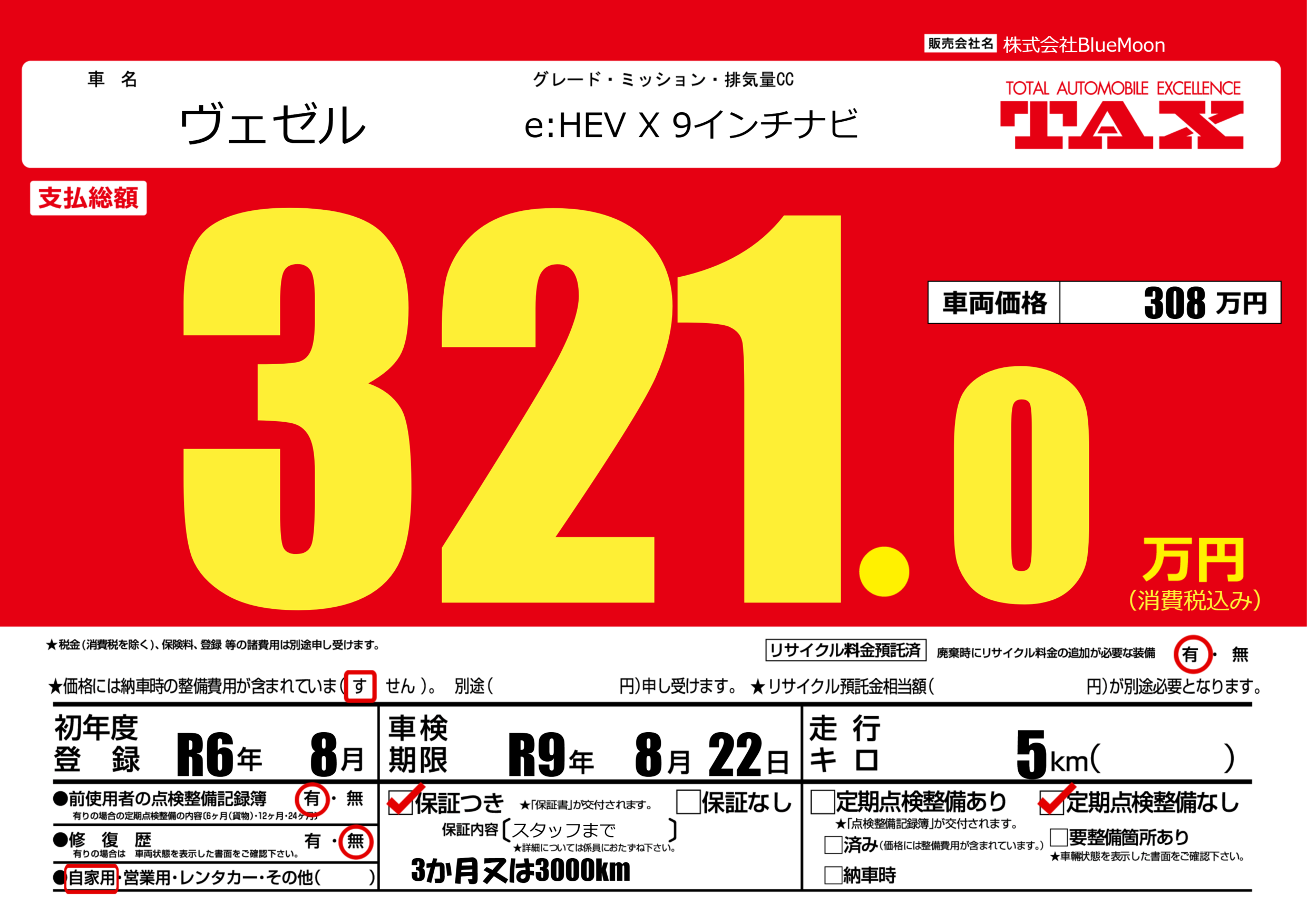 | 車名 | ヴェゼル | グレード ミッション 排気量 |