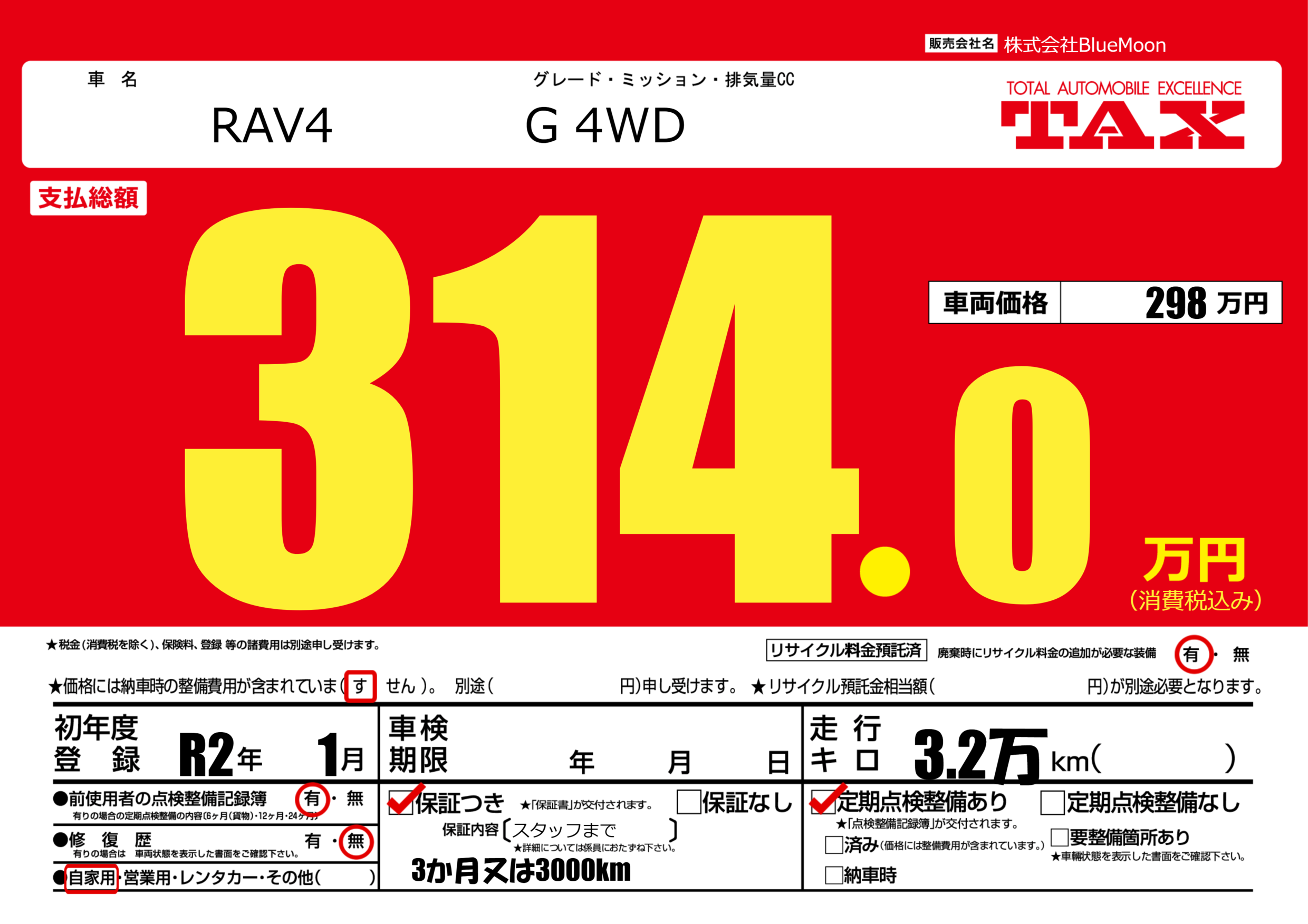 保証付き 保証内容(スタッフまで) ---ヶ月または()千kmまで |