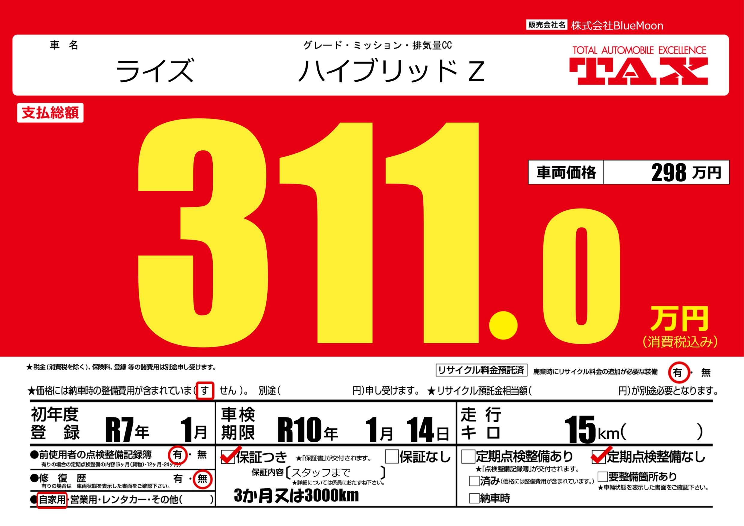 | 走行キロ | 1.5万km | 初年度登録 | R7年1月 |