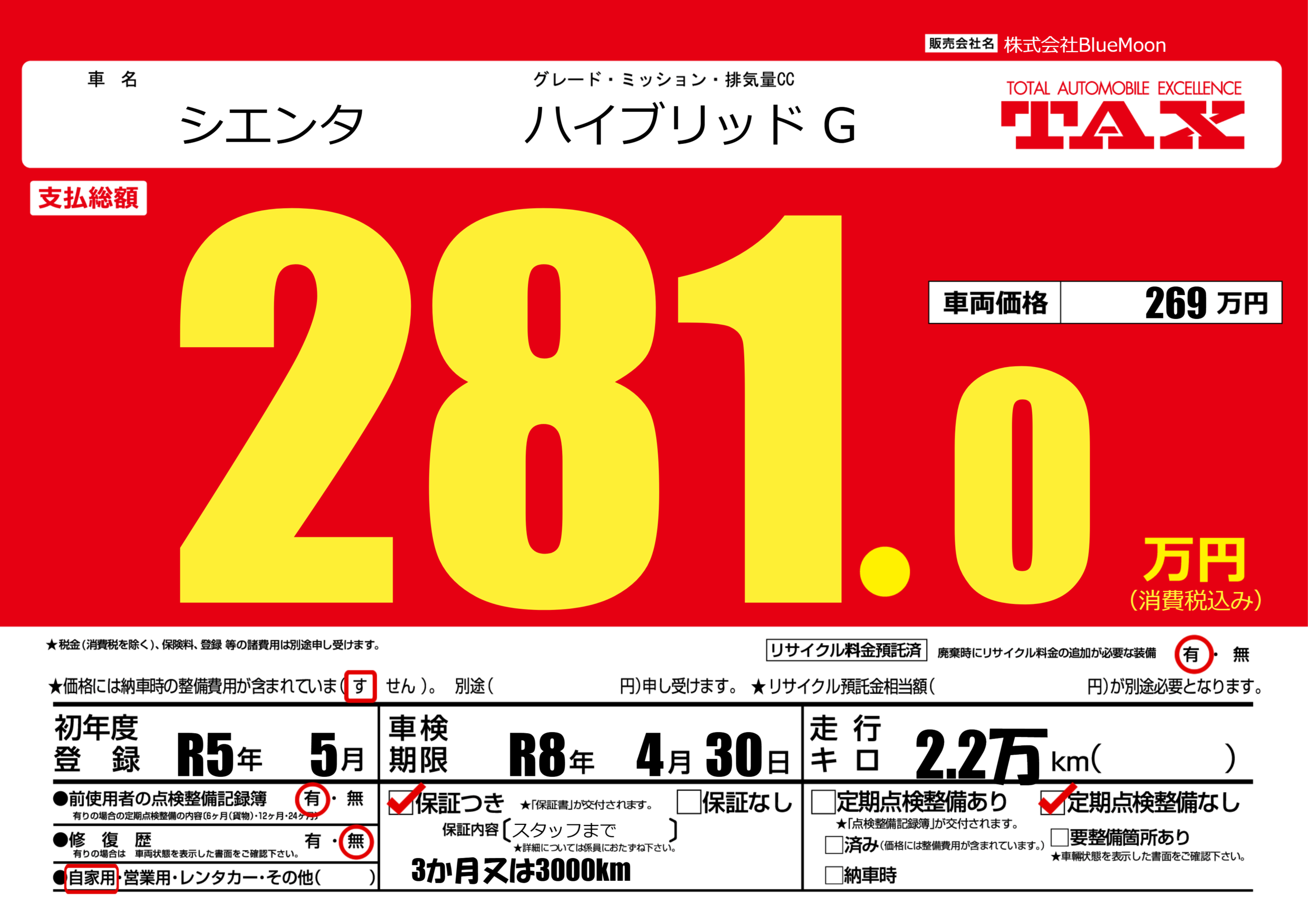 | 車名 | シエンタ | グレード ミッション 排気量 |