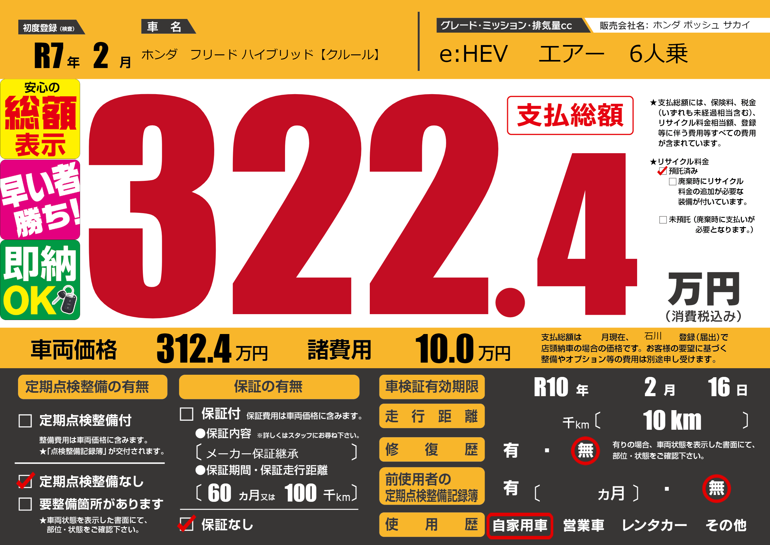| 車名 | ホンダ フリード ハイブリッド【クルール】 | グレード ミッション 排気量 |