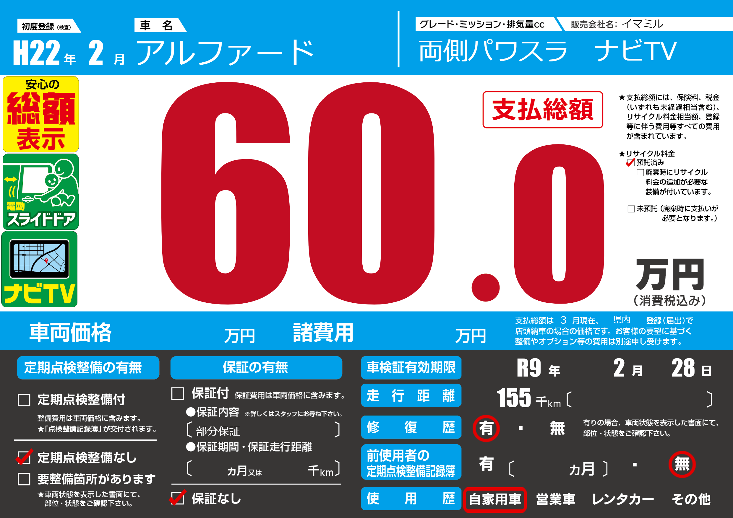 | 走行キロ | 15.5万km | 初年度登録 | H22年2月 |