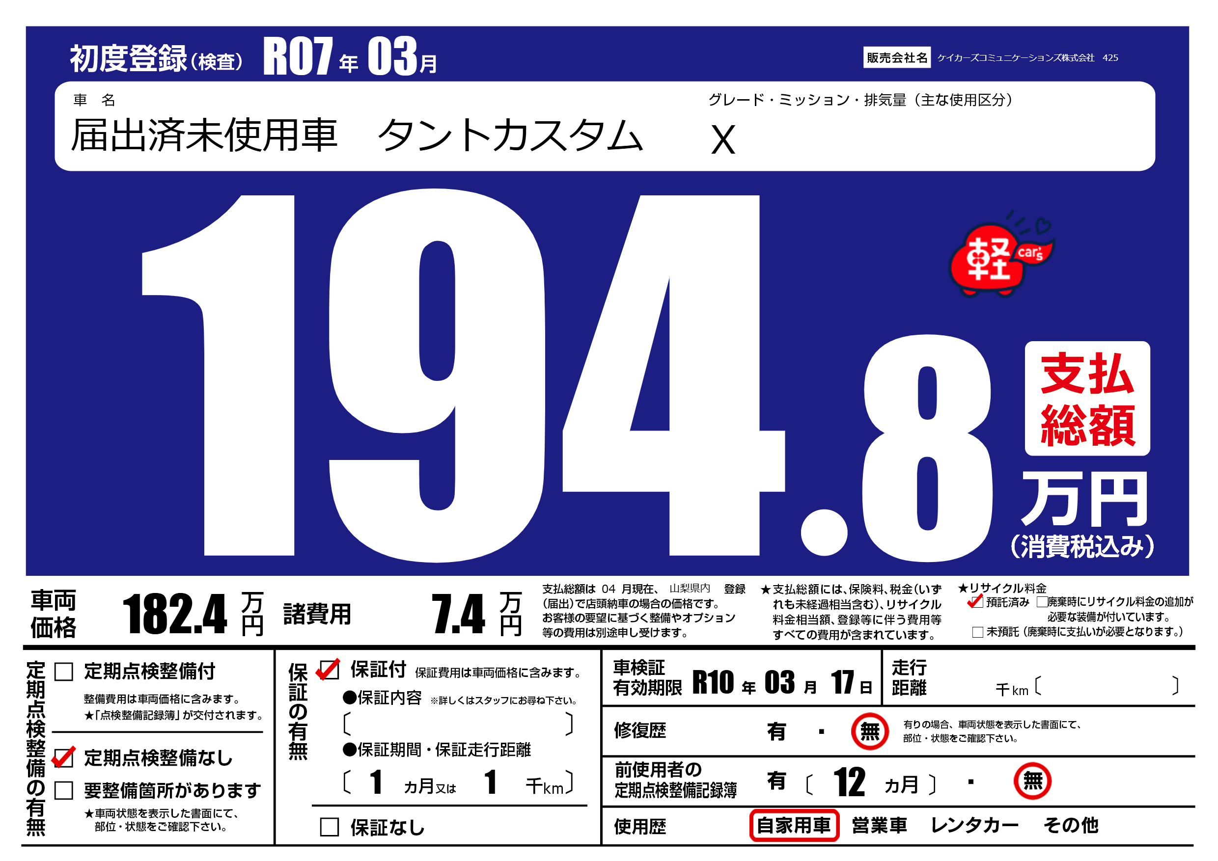 | 車名 | 届出済未使用車 タントカスタム | グレード ミッション 排気量 |
