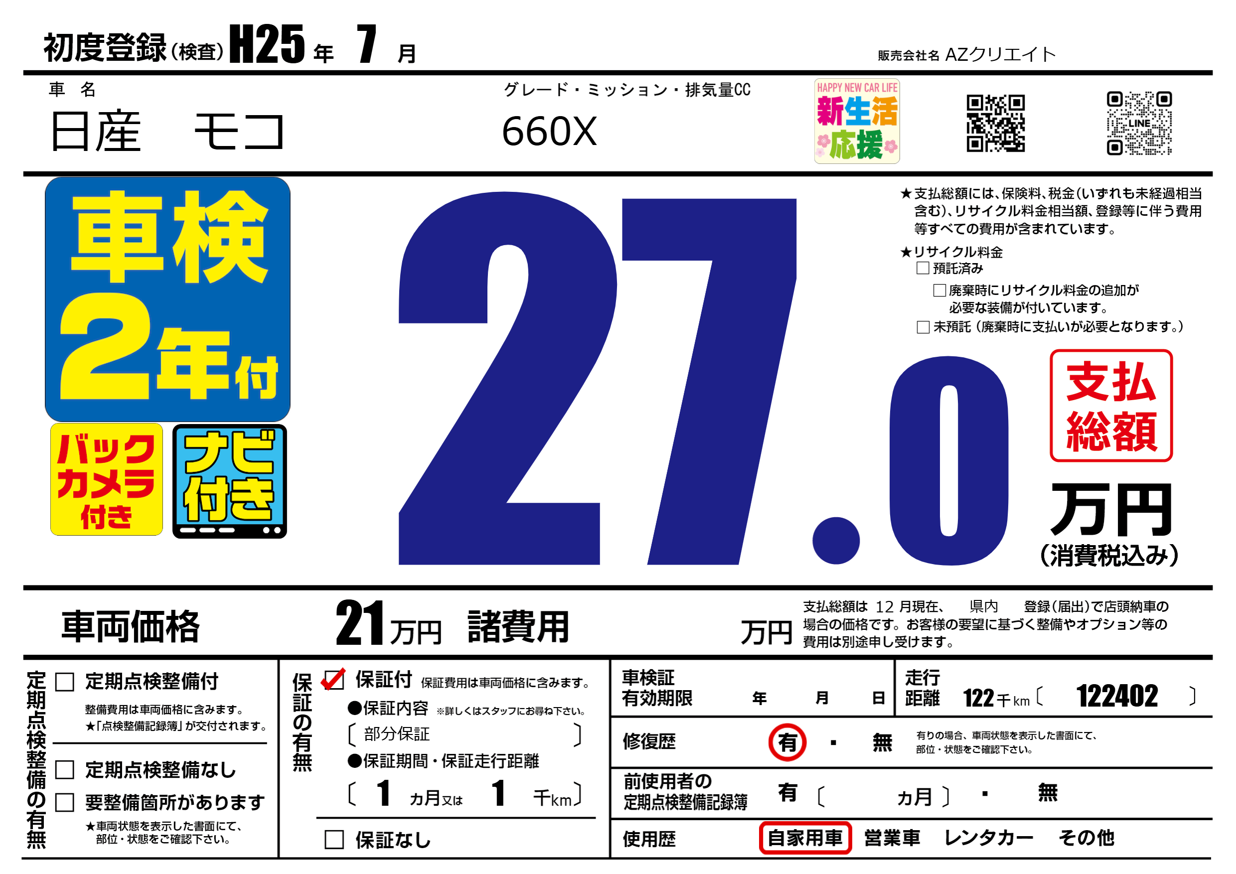 | 走行キロ | 12.2万km | 初年度登録 | H25年7月 |