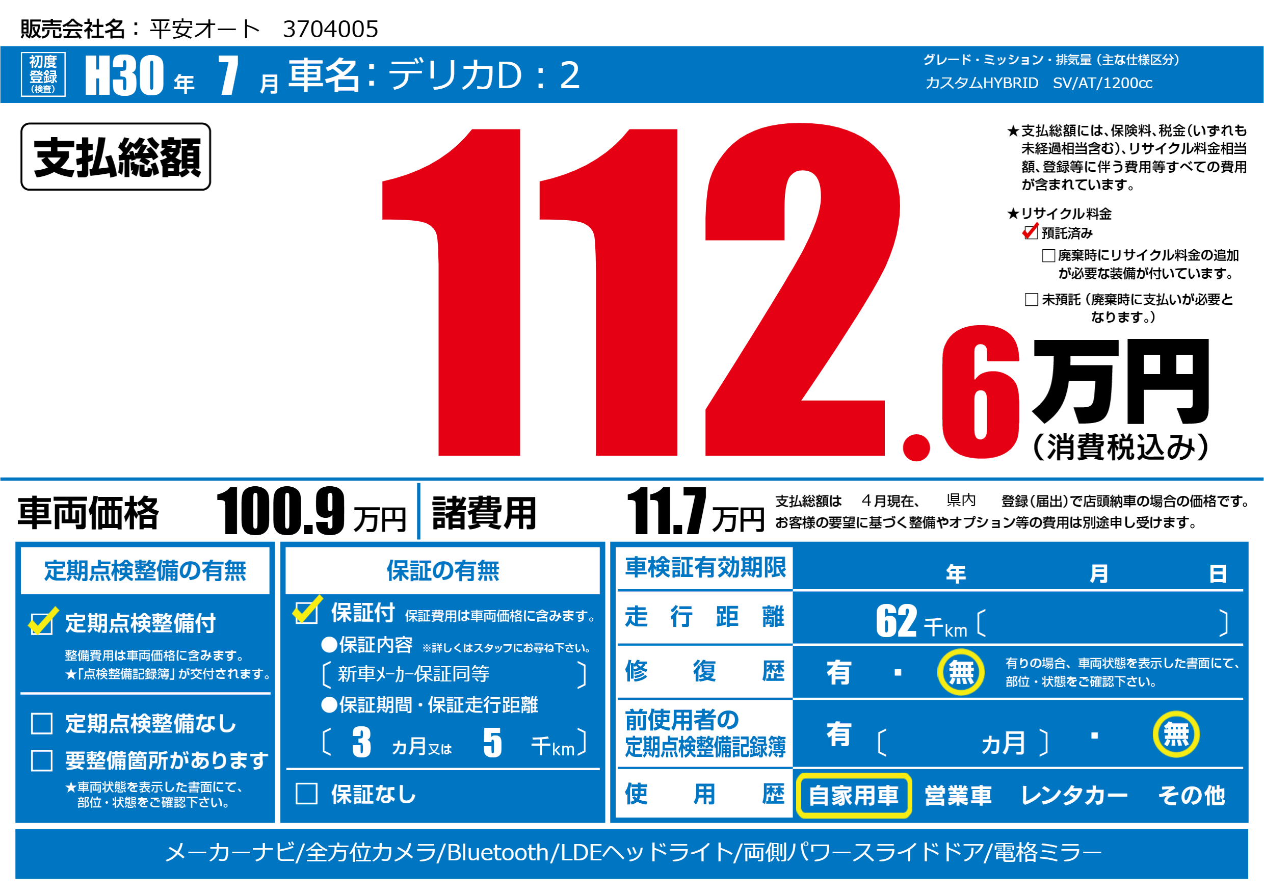 | 初年度登録 | H30年7月 | ||