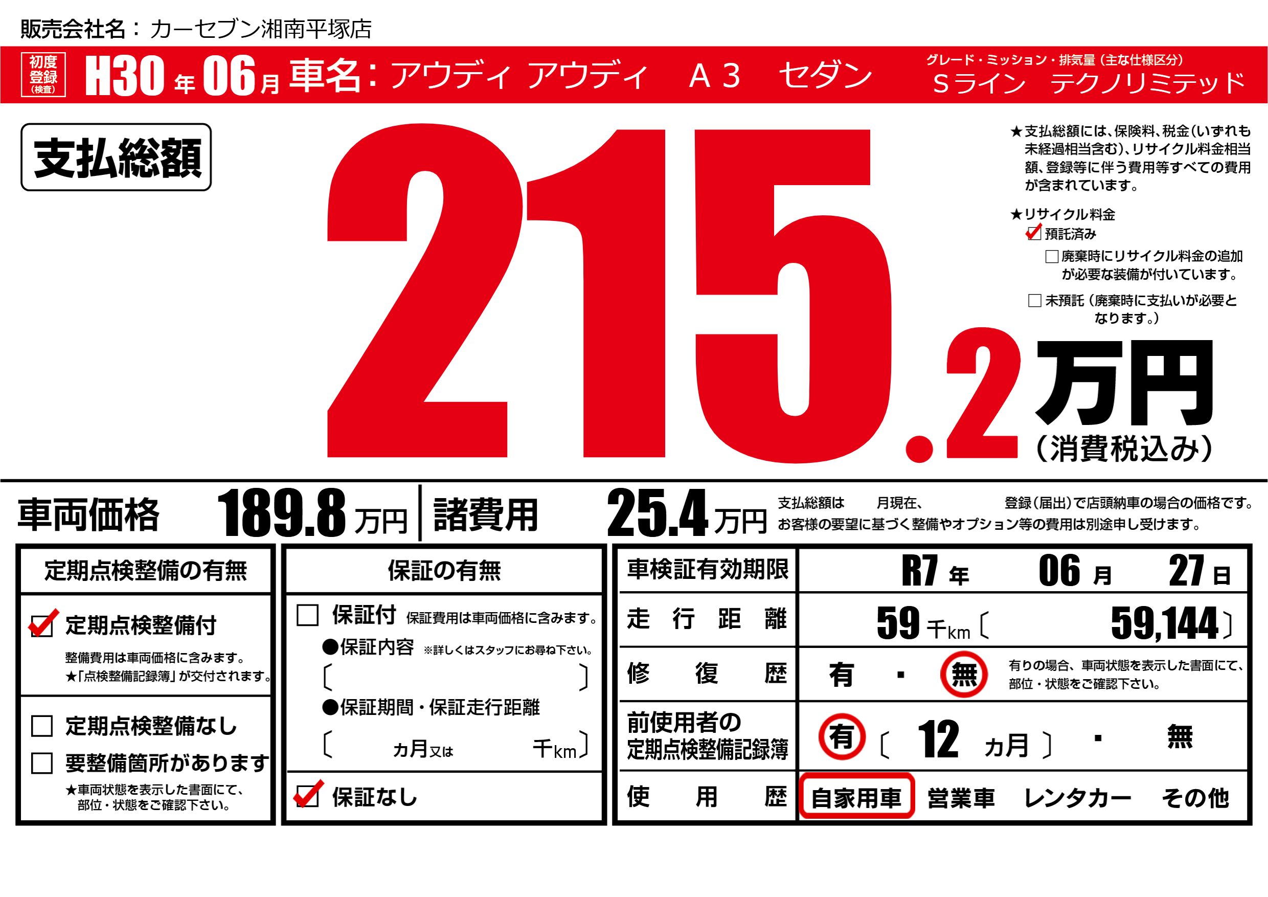 | 車名 | アウディ アウディ A3 セダン | グレード ミッション 排気量 |